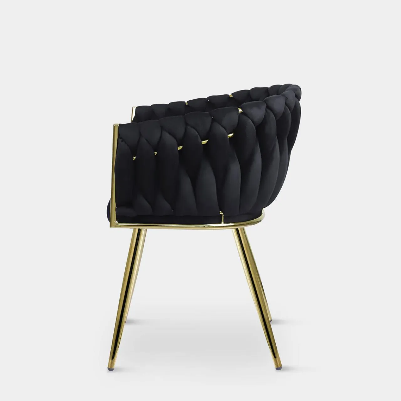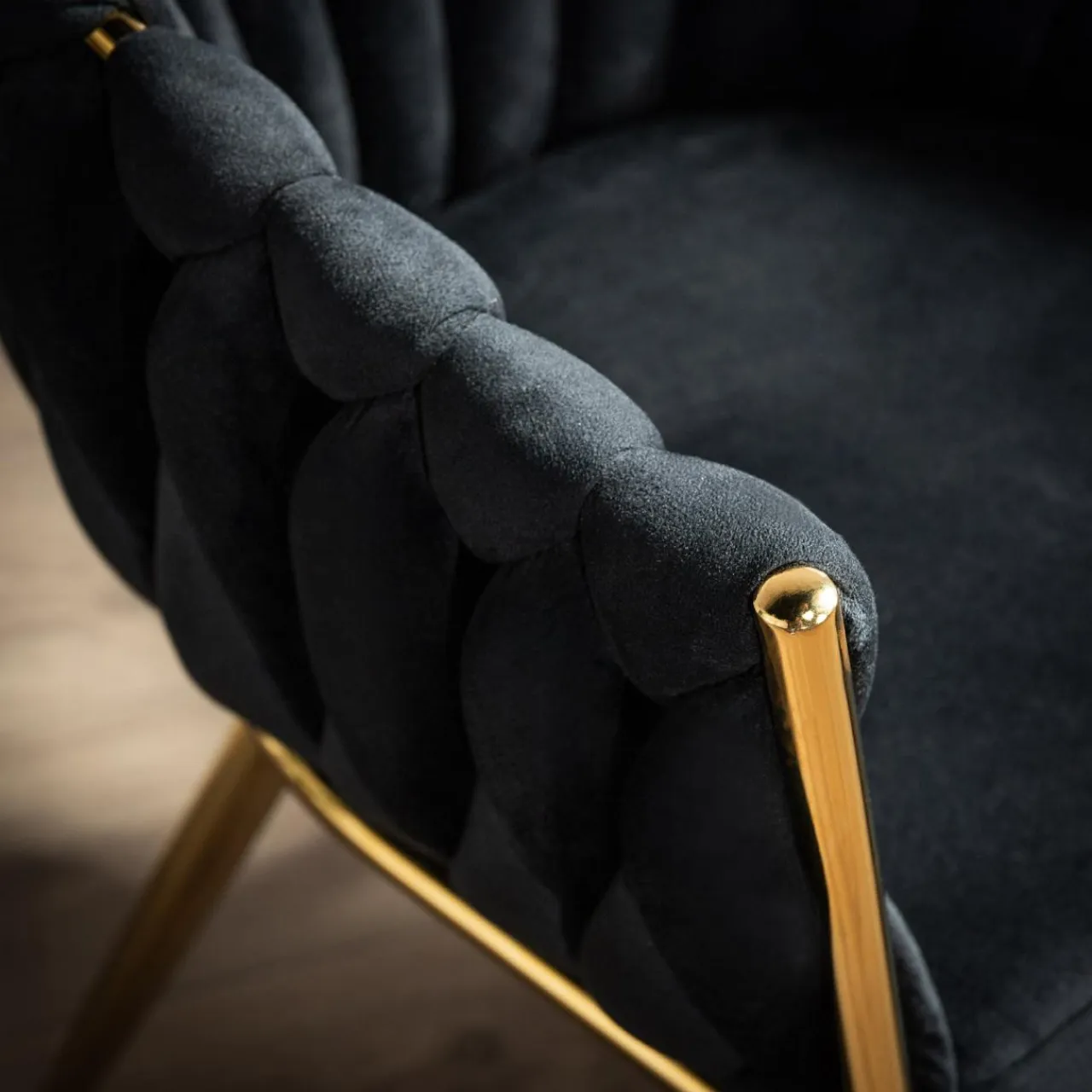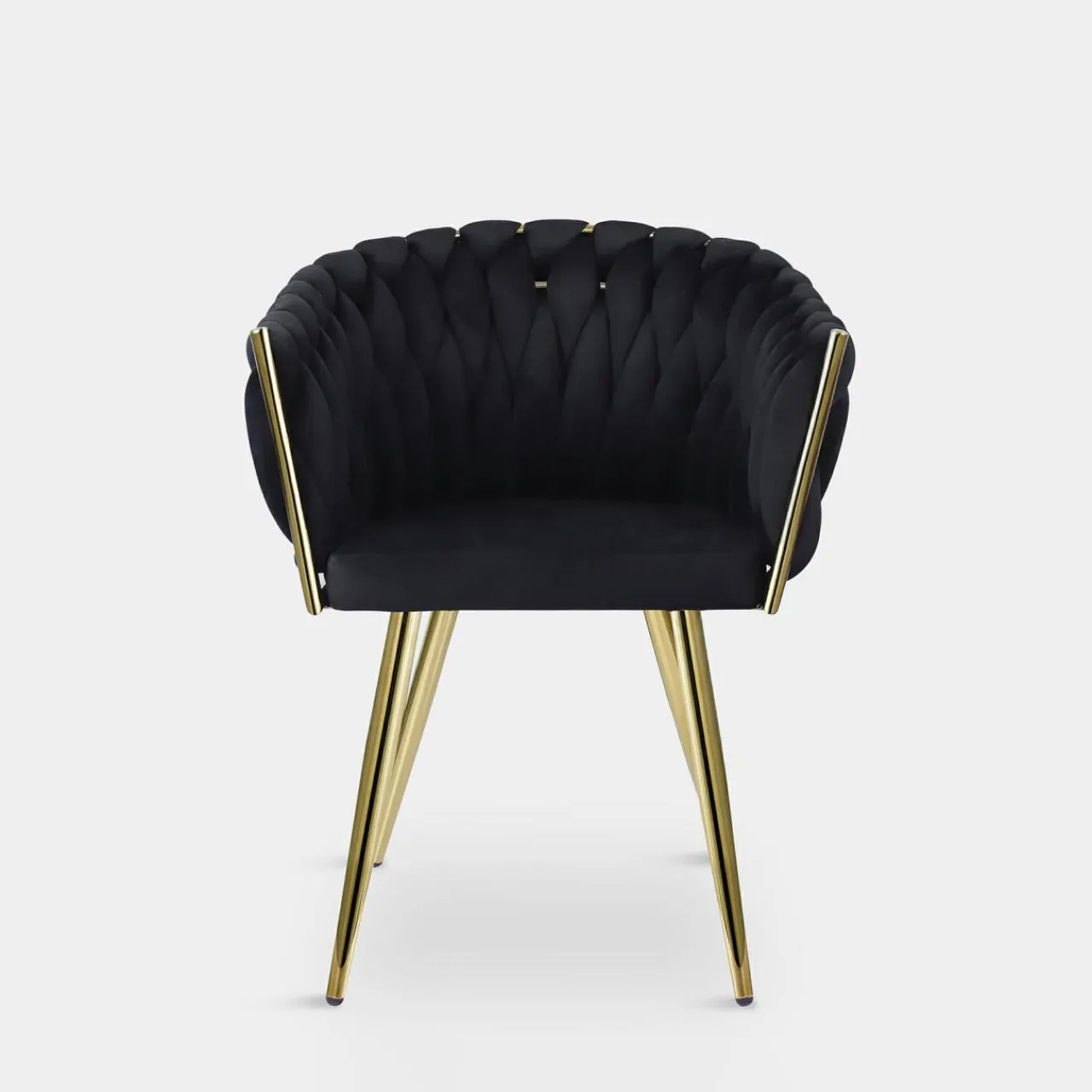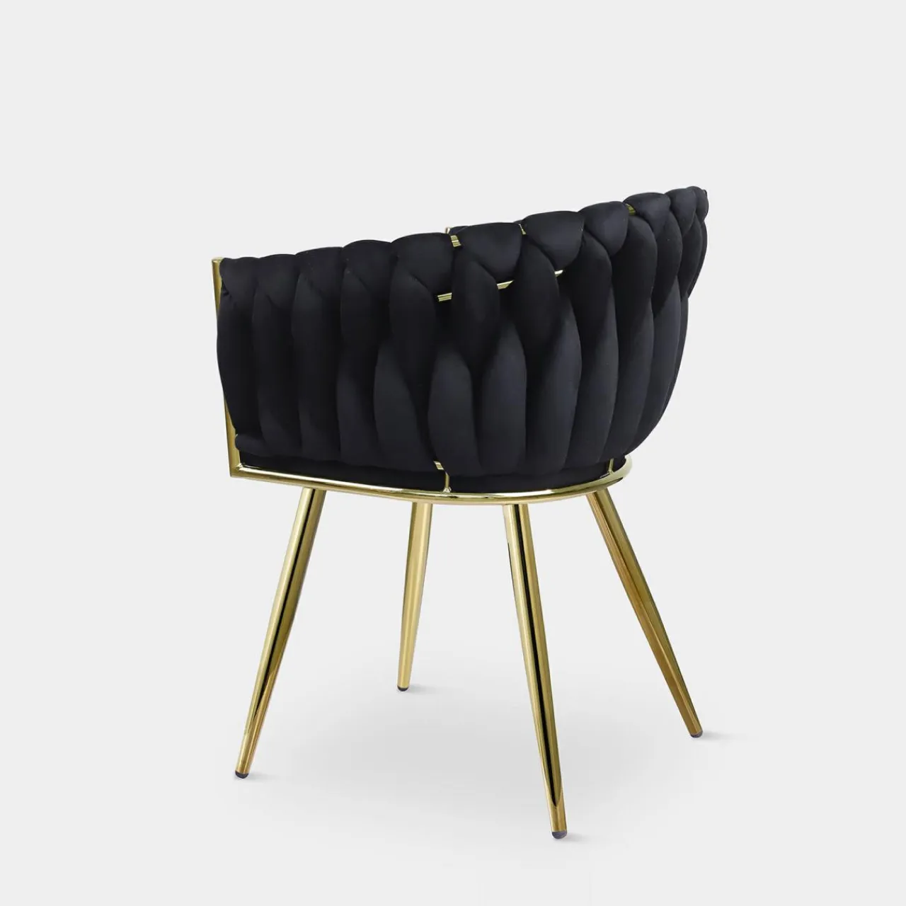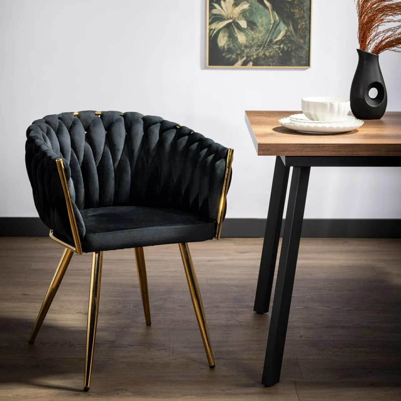 - Krzesło zostało obite miłym w dotyku welurem w czarnym kolorze, który podkreśla plecione oparcie.