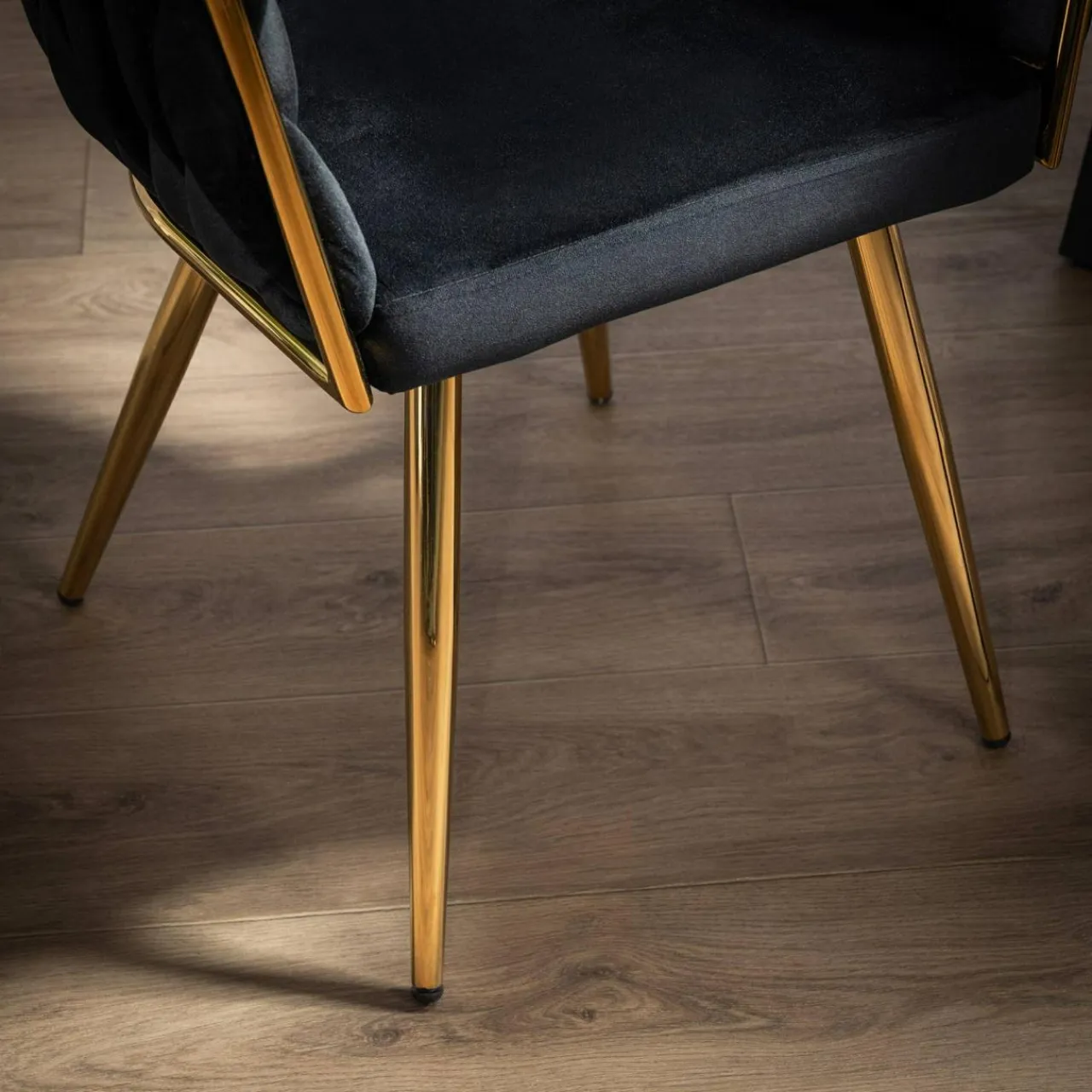 - Podstawa krzesła składa się z 4 metalowych nóg w kolorze złotym, które estetycznie wkomponują się w aranżacje w stylu glamour.