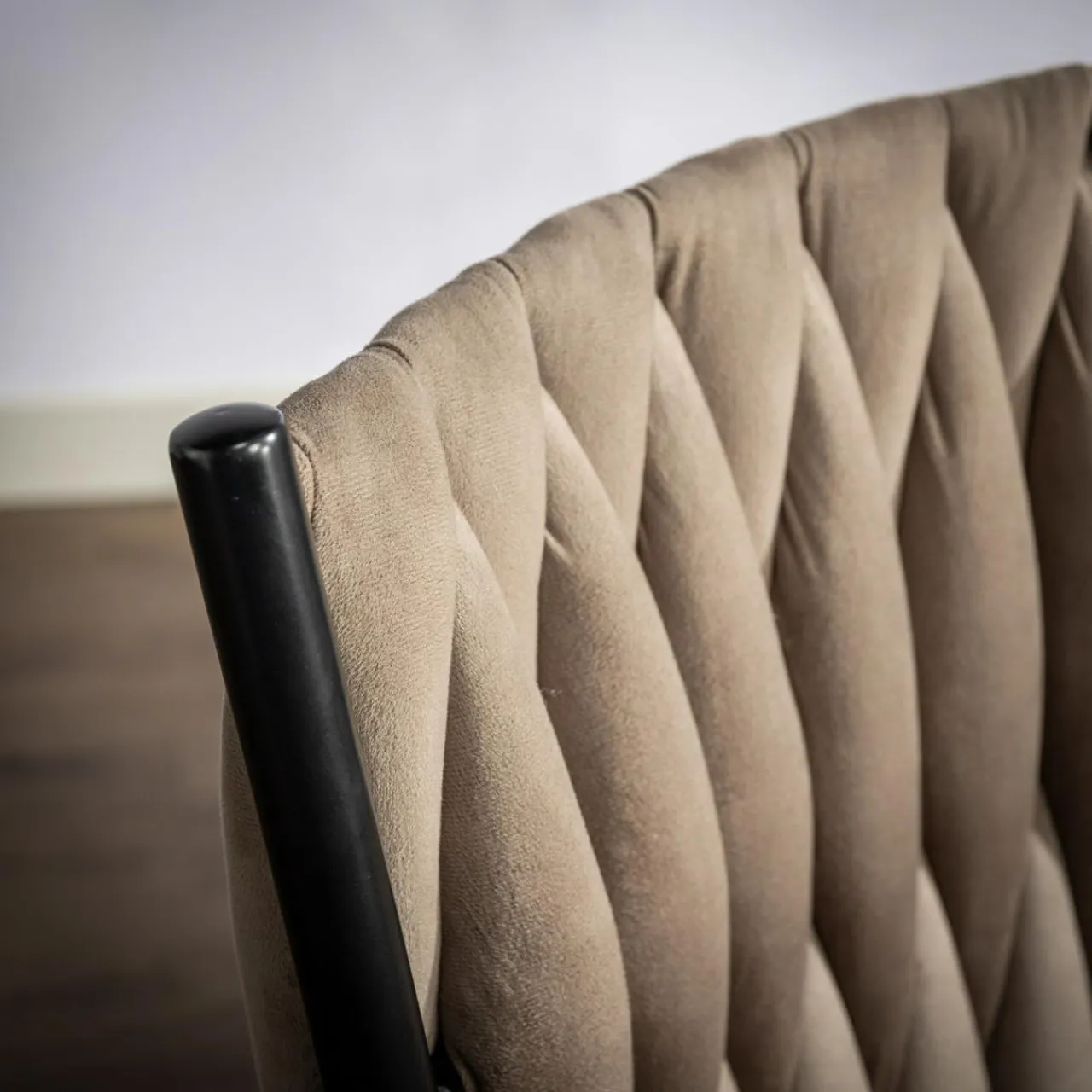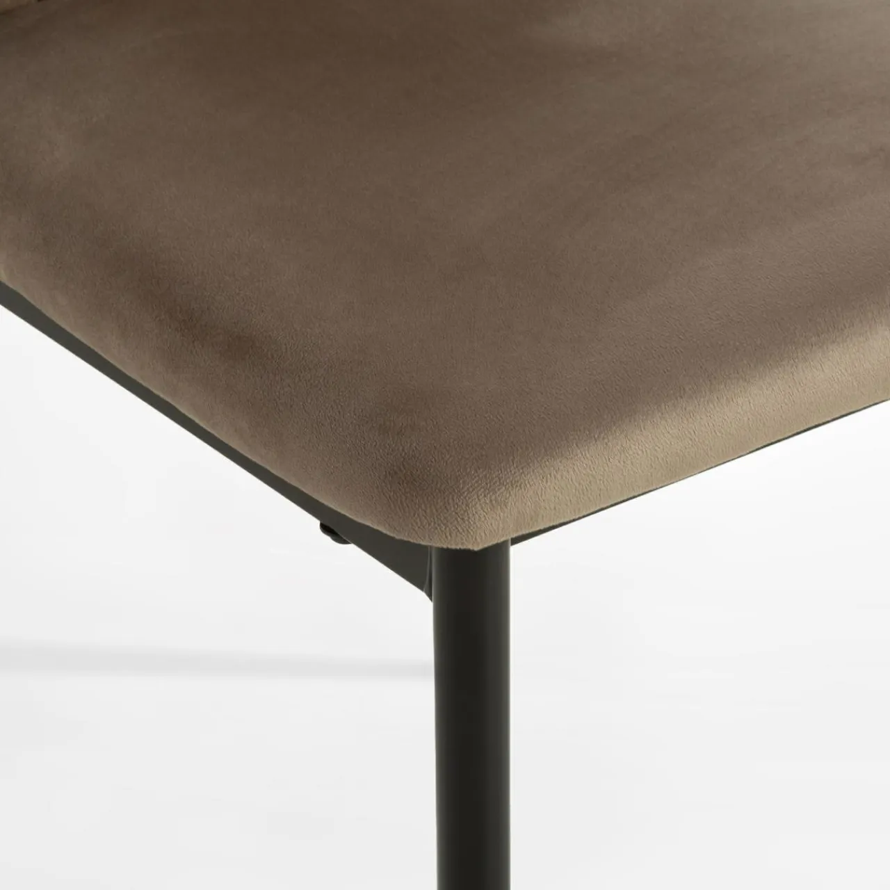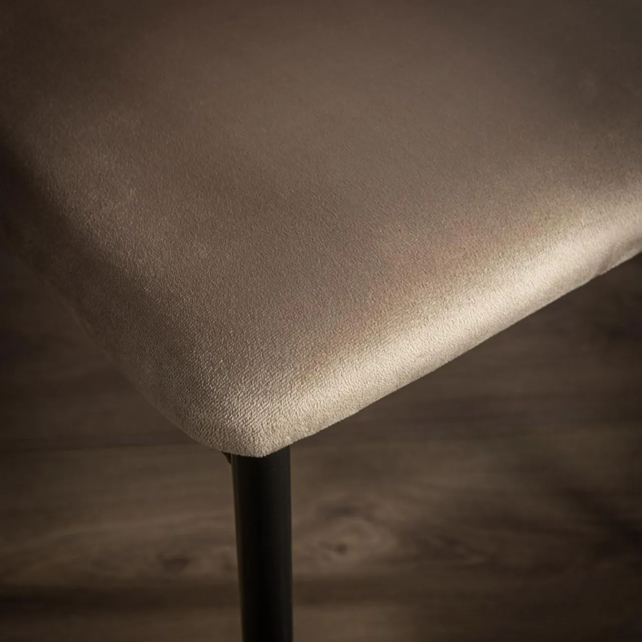 - Krzesło zostało obite miłym w dotyku welurem w szarobeżowym kolorze.