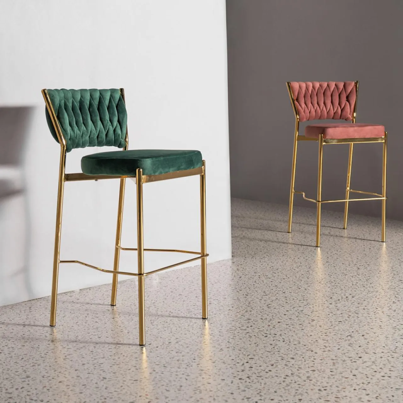 Lubiane krzesło LIANA teraz w wersji barowej! Eleganckie krzesło z welurową plecionką i złotymi nogami podkreśli stylową aranżację jadalni. Idealnie wpasuje się w wystrój glamour i retro.