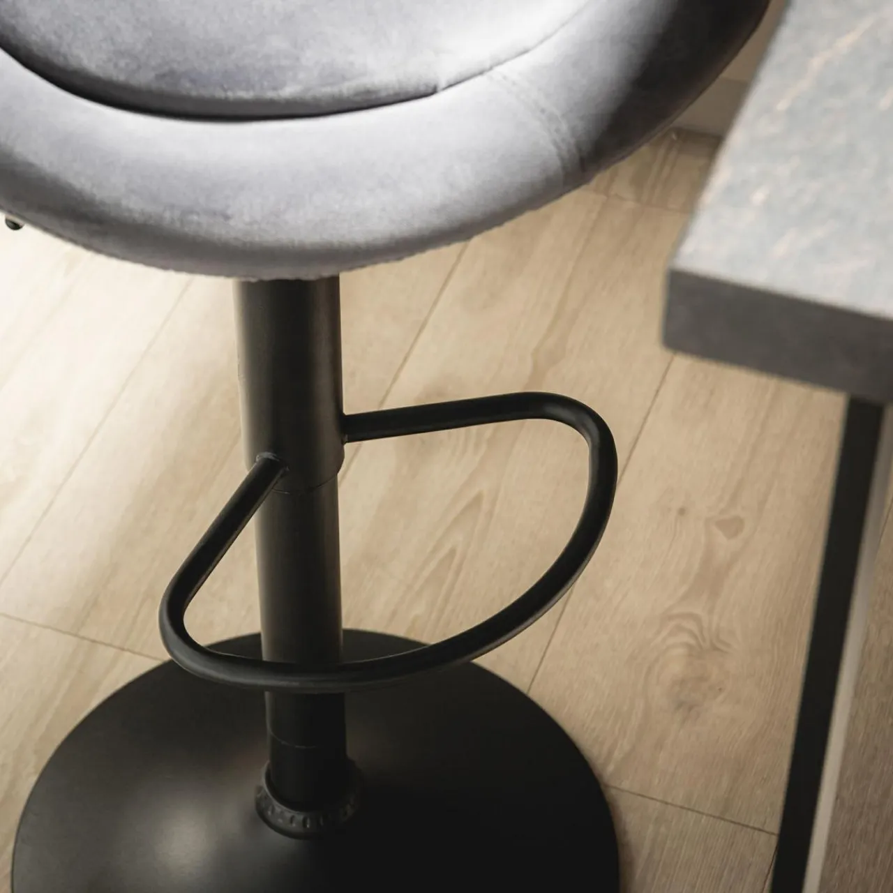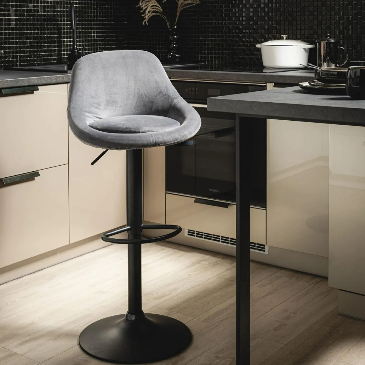 Szara tapicerka i czarna, matowa noga dopełnią każdą aranżację w stylu glamour. Sprawi, że industrialna kuchnia nabierze przytulnego charakteru.