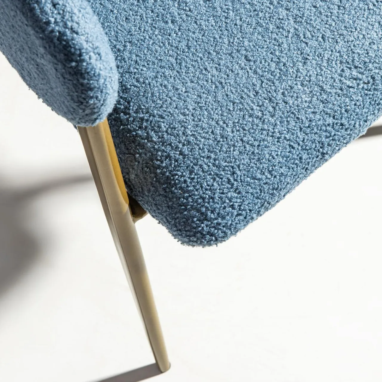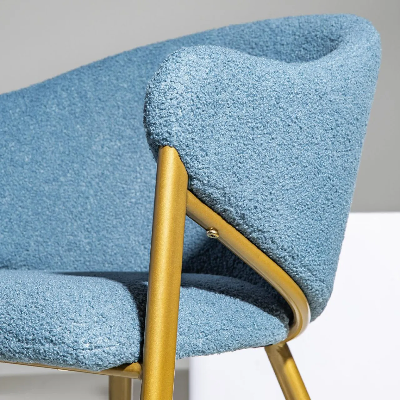 - Stalowy stelaż pomalowano na złoty kolor – współgra z niebieską tapicerką, tworząc elegancki duet.