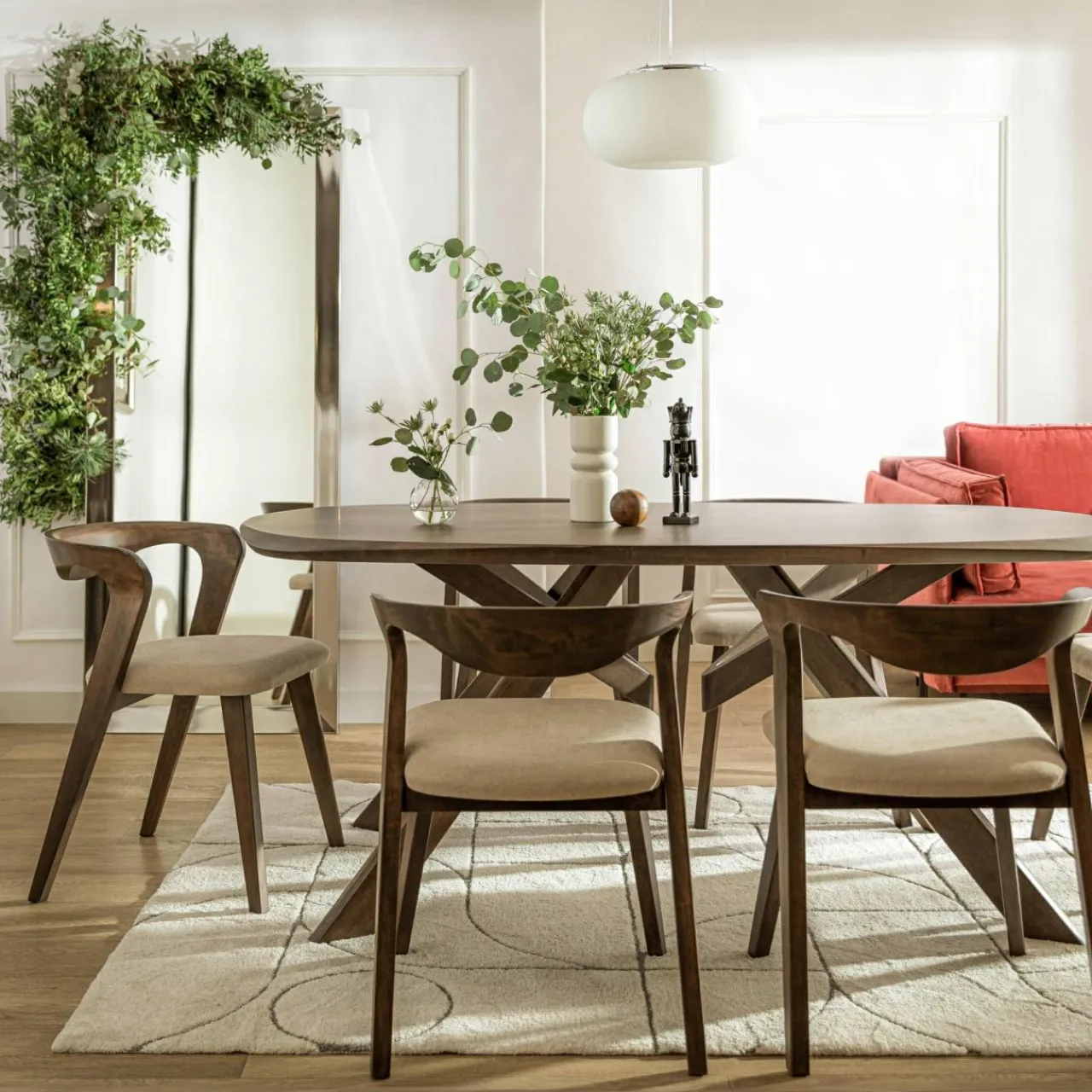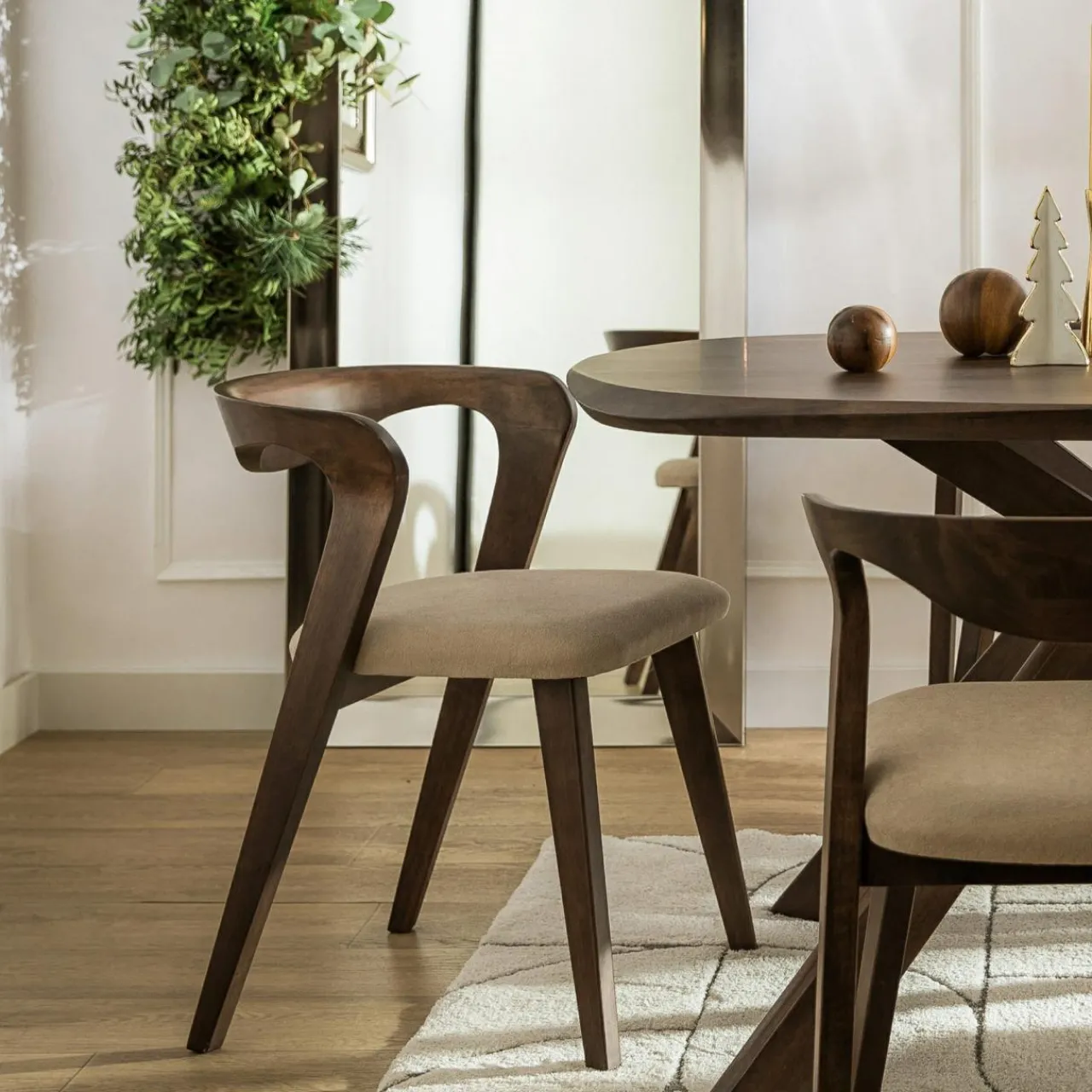 - Zaoblone krawędzie krzesła, jak i materiał z którego jest wykonane – drewno kauczukowe, sytuują ten model blisko natury.