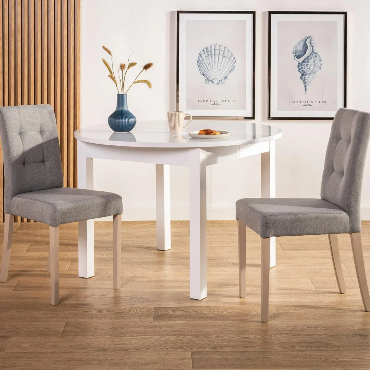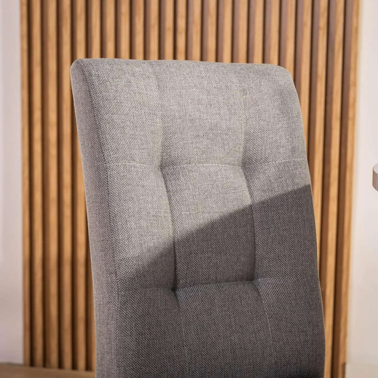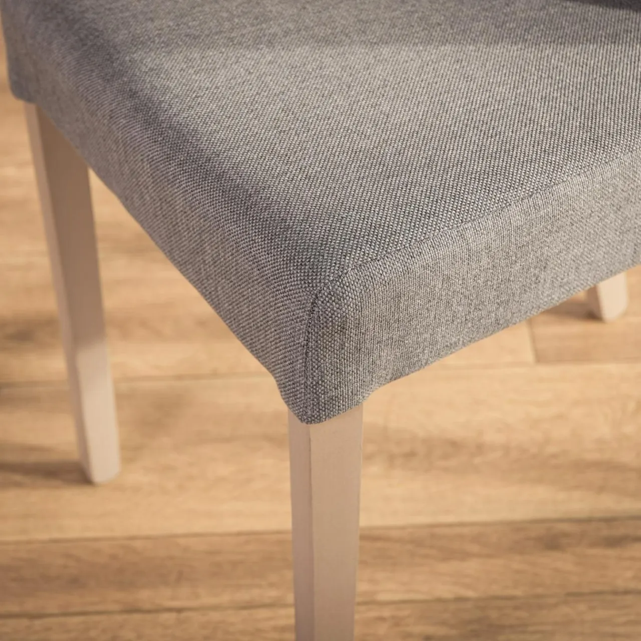 Połączenie lakierowanego drewna z plecioną tkaniną, imitującą strukturę lnu sprawia, że krzesło można wpasować w przestrzeń, wypełnioną naturalnymi dodatkami.