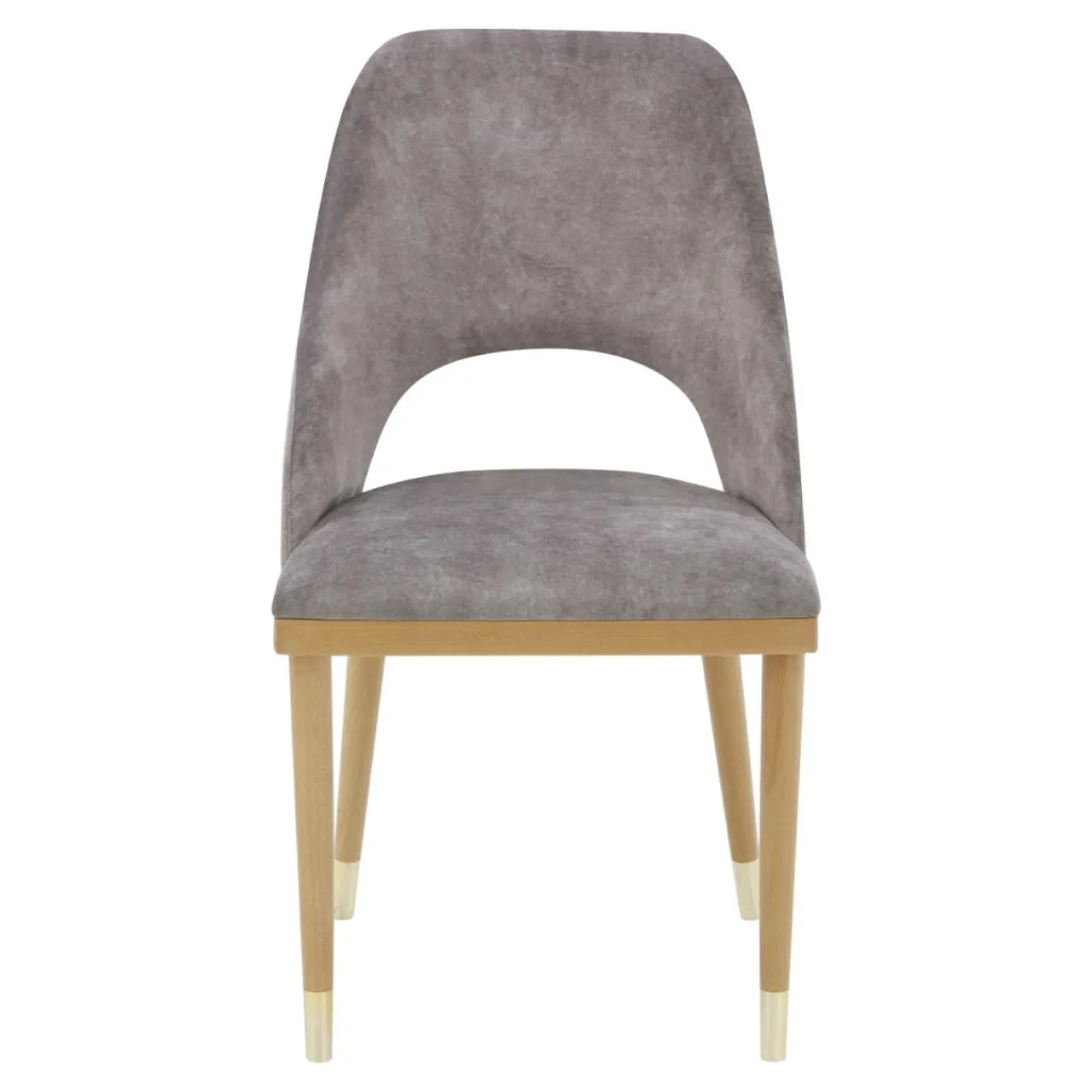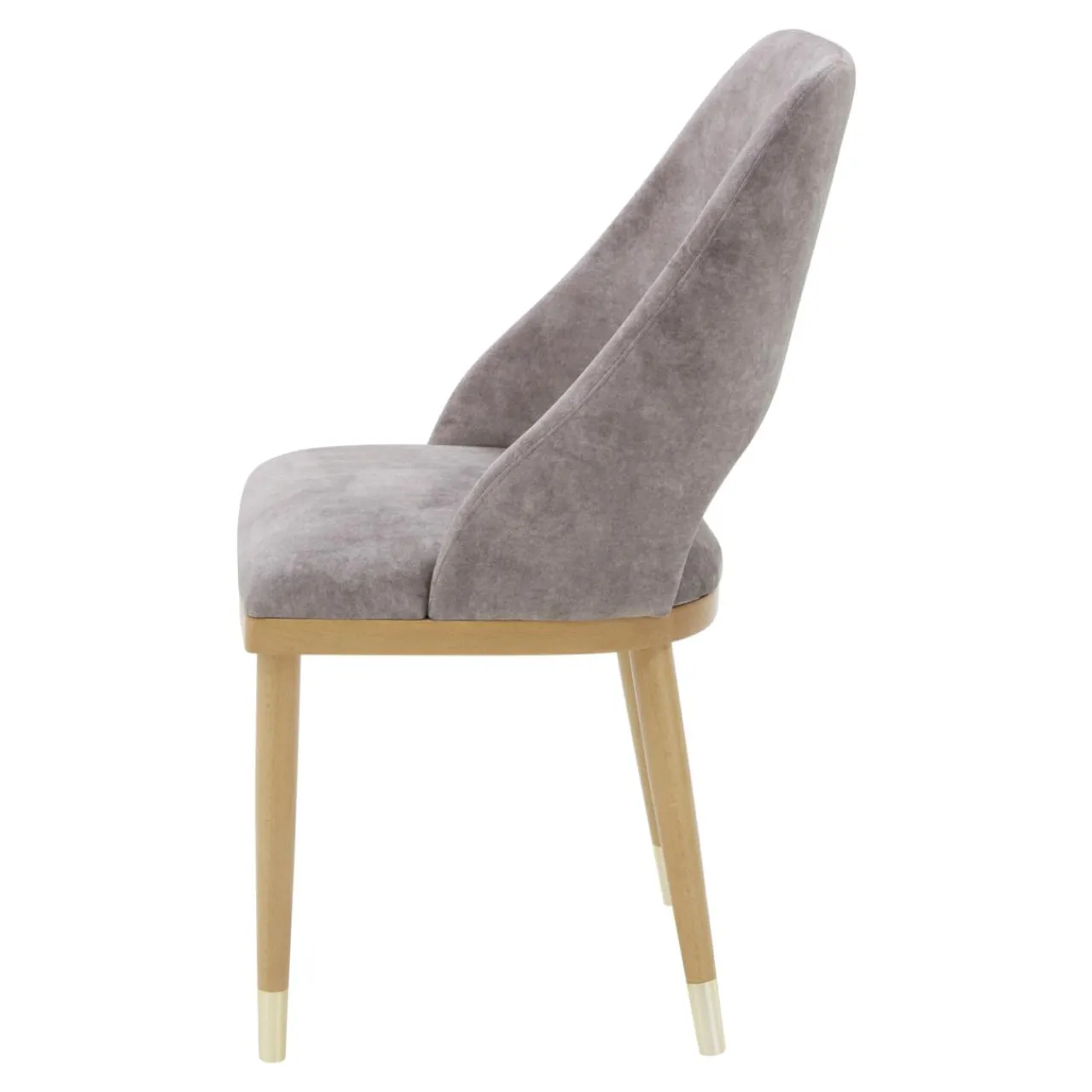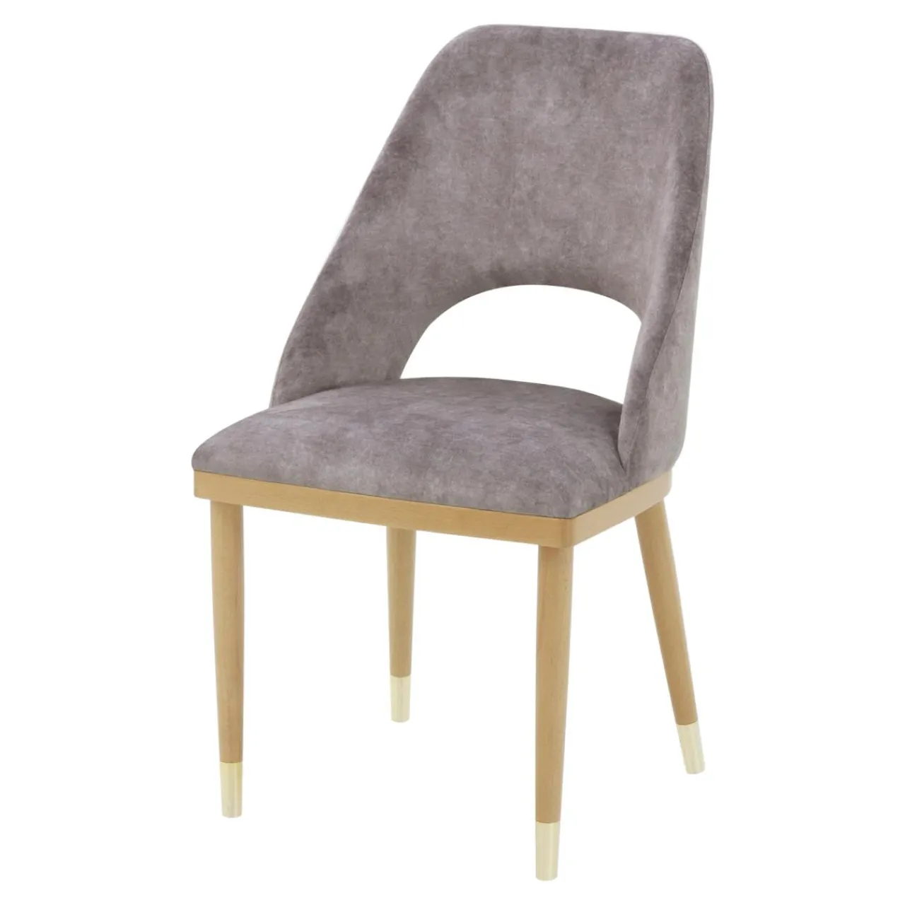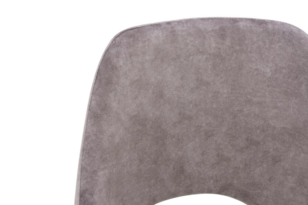 Krzesło YONAS zostało obite tkaniną w szarobeżowym odcieniu. Miękki welur podkreśla otulającą budowę mebla.