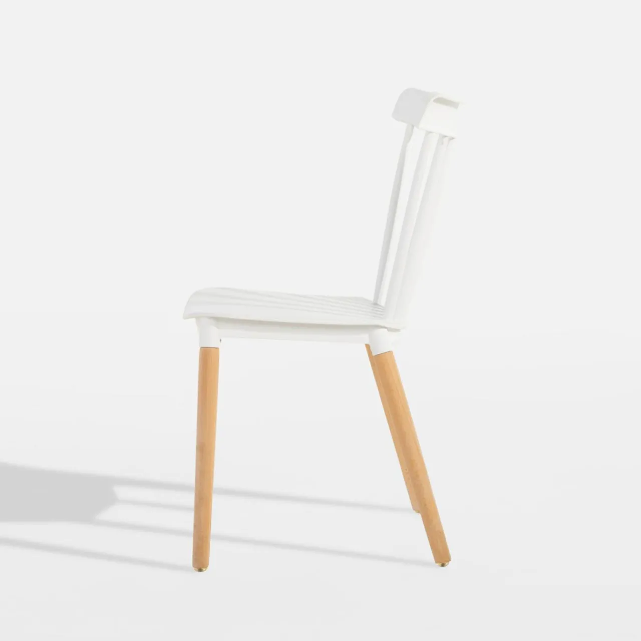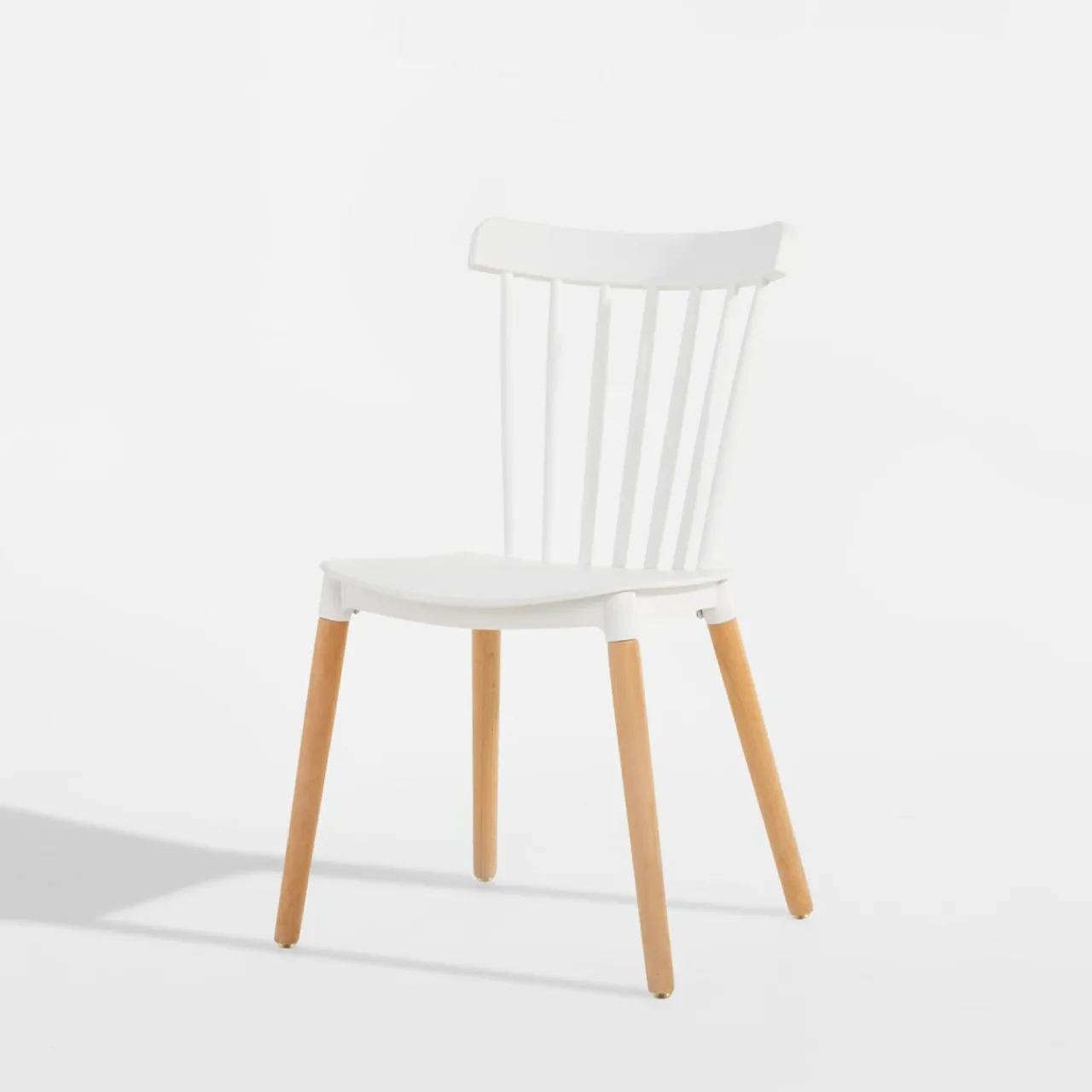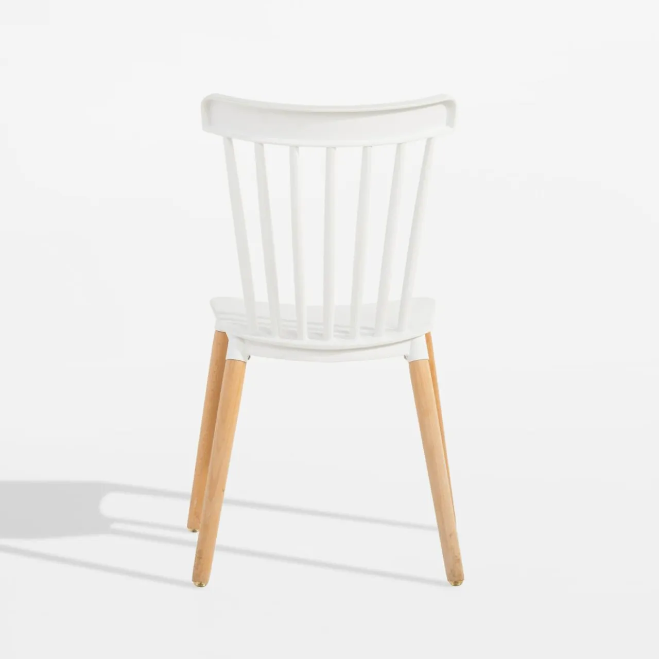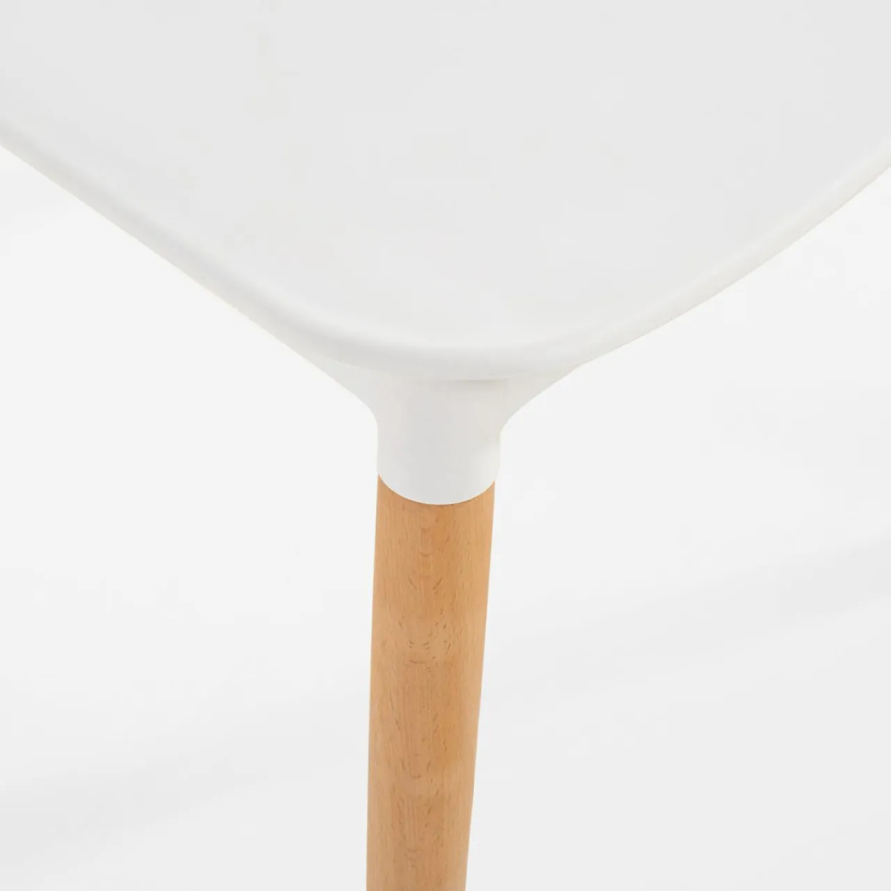 - Drewniane nogi w naturalnym odcieniu drewna łączą się z wykonanymi z tworzywa siedziskiem oraz oparciem, które wybarwiono na biało. Całość prezentuje się ciekawie i nowocześnie.