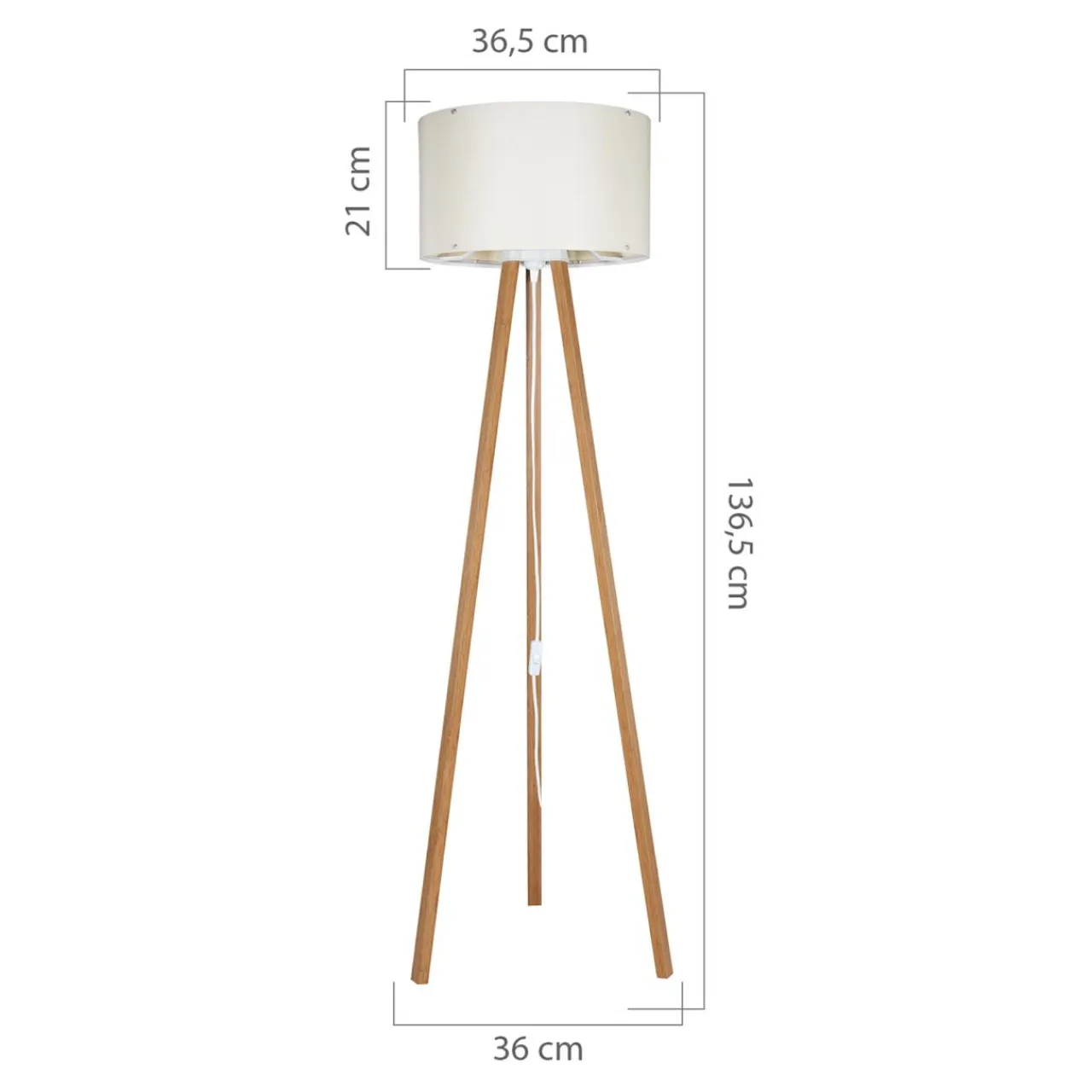 Lampa podłogowa PIKO została zwieńczona abażurem o nowoczesnym kształcie walca. Jego kremowy kolor dopełnia podstawy z jasnego drewna.