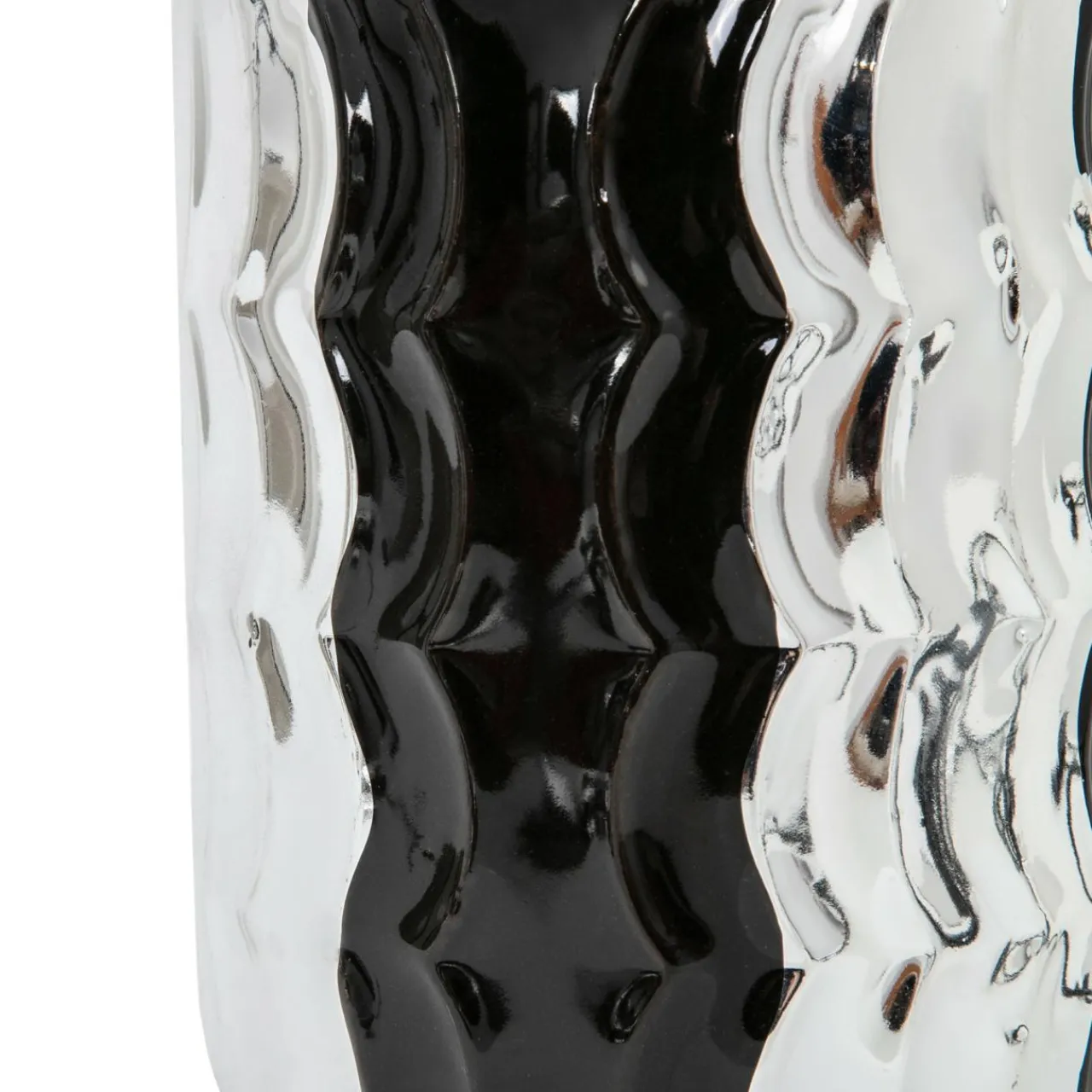 Jej zdobna czarno-srebrnymi falami podstawa uzupełniona czarnym abażurem idealnie dopełni wnętrze sypialni lub salonu.