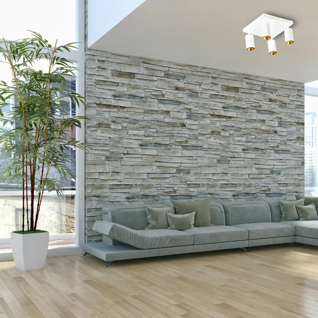 Jej nowoczesna stylistyka idealnie pasuje do przestronnego salonu w minimalistycznym stylu. Podstawa na bazie kwadratu posiada 4 reflektory umieszczone na każdym z rogów.
