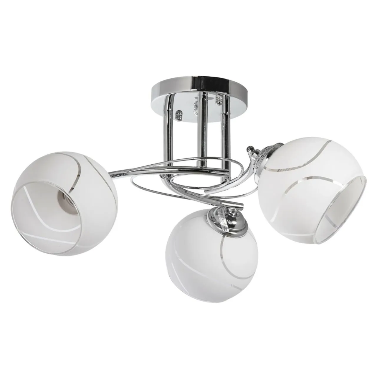 Fantazyjnie wygięta oprawa w jasnej, chromowanej kolorystyce w urokliwy sposób współgra z trzema kulistymi kloszami ozdobionymi subtelnym motywem dekoracyjnym.