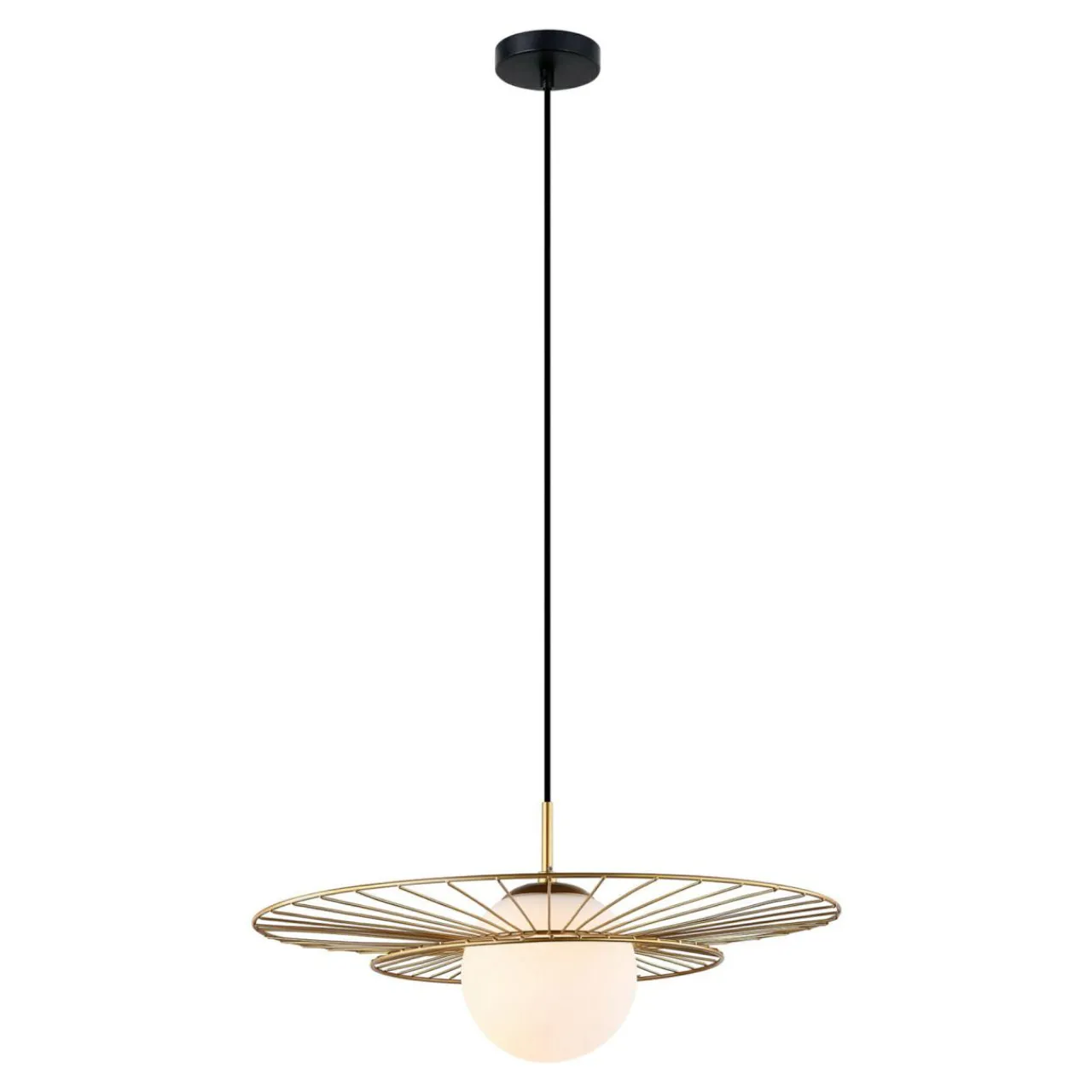 - Kulisty klosz lampy wykonany został ze szkła oraz cienkich metalowych elementów, które tworzą wokół niego półprzeźroczystą konstrukcję.