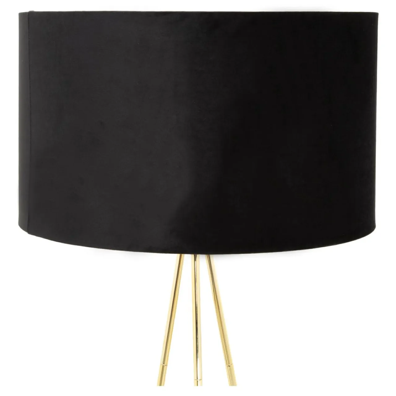 Przede wszystkim zwraca uwagę welurowe wykończenie oraz czarny kolor abażura, który doskonale współgra ze złotym wykończeniem trójnogu.