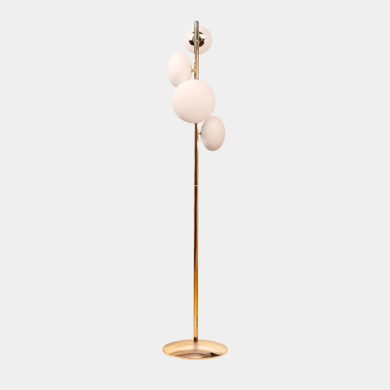 4 mlecznobiałe klosze połączone podstawą w złotym kolorze udekorują pomieszczenie i podkreślą jego charakterystyczne cechy.