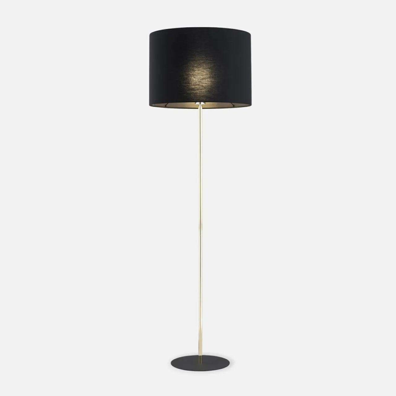 Design tej lampy opiera się na smukłej nóżce w złotym kolorze z okrągłą podstawą, którą wieńczy czarny abażur.