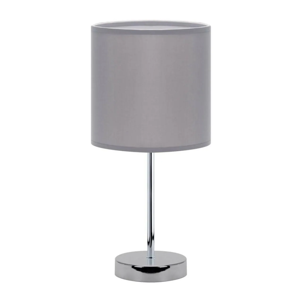Prosta i smukła metalowa podstawa ze stali nierdzewnej ładne uzupełnia jasna tonację kolorystyczną pomieszczenia. Na osobną uwagę zasługuje abażur z tkaniny wzmocnionej tworzywem w szarym kolorze. Prosty kształt walca stanowi doskonałe zwieńczenie lampy oraz neutralne tło dla ozdób i dodatków aranżacyjnych.