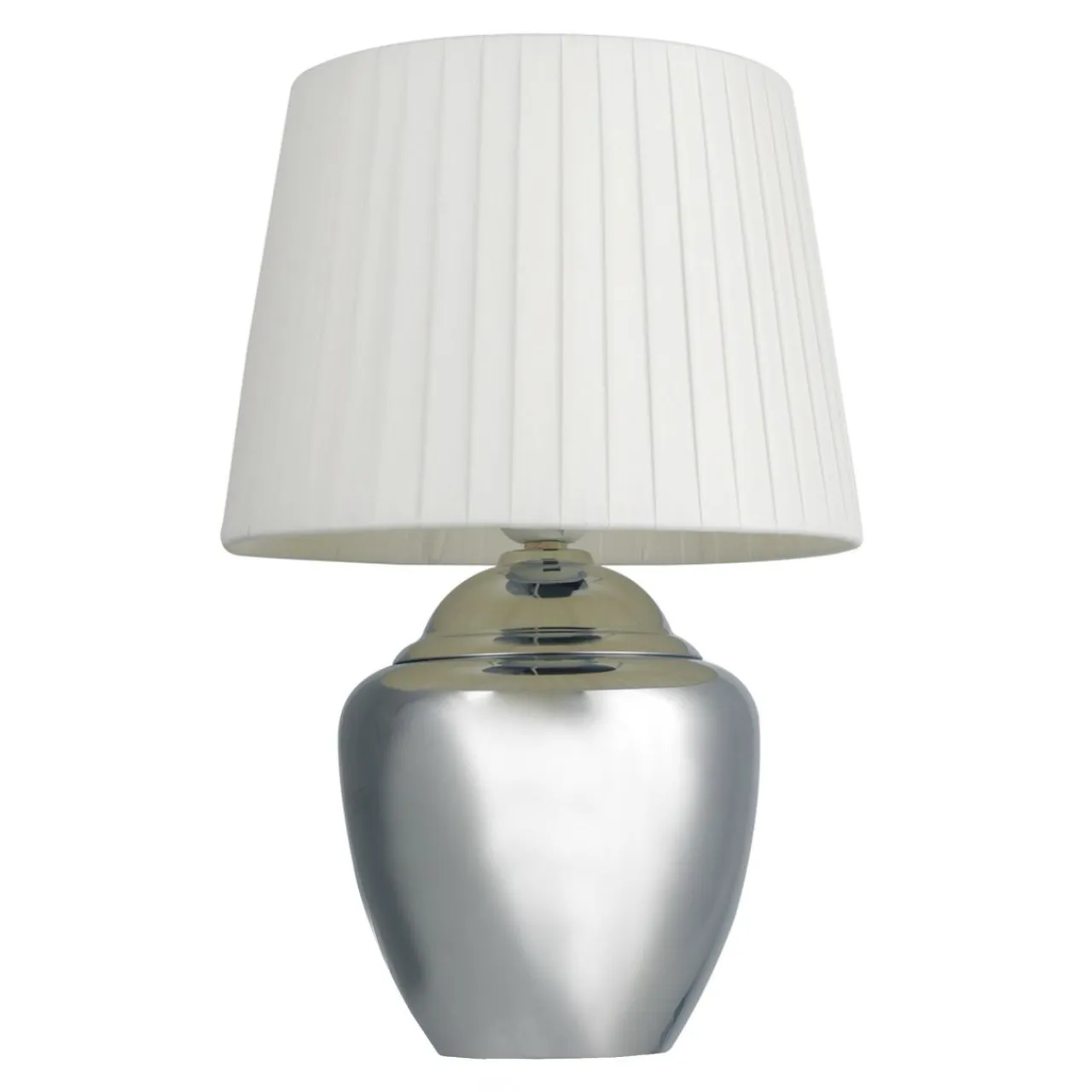 Niniejszy model lampy stołowej ma metalową podstawę o wykończeniu w kolorze srebra z połyskiem. Lampę wieńczy abażur o kształcie trapezu i wykończeniu białą tkaniną. Dodatkowym atutem są zdobienia na jego powierzchni przypominające falbany.