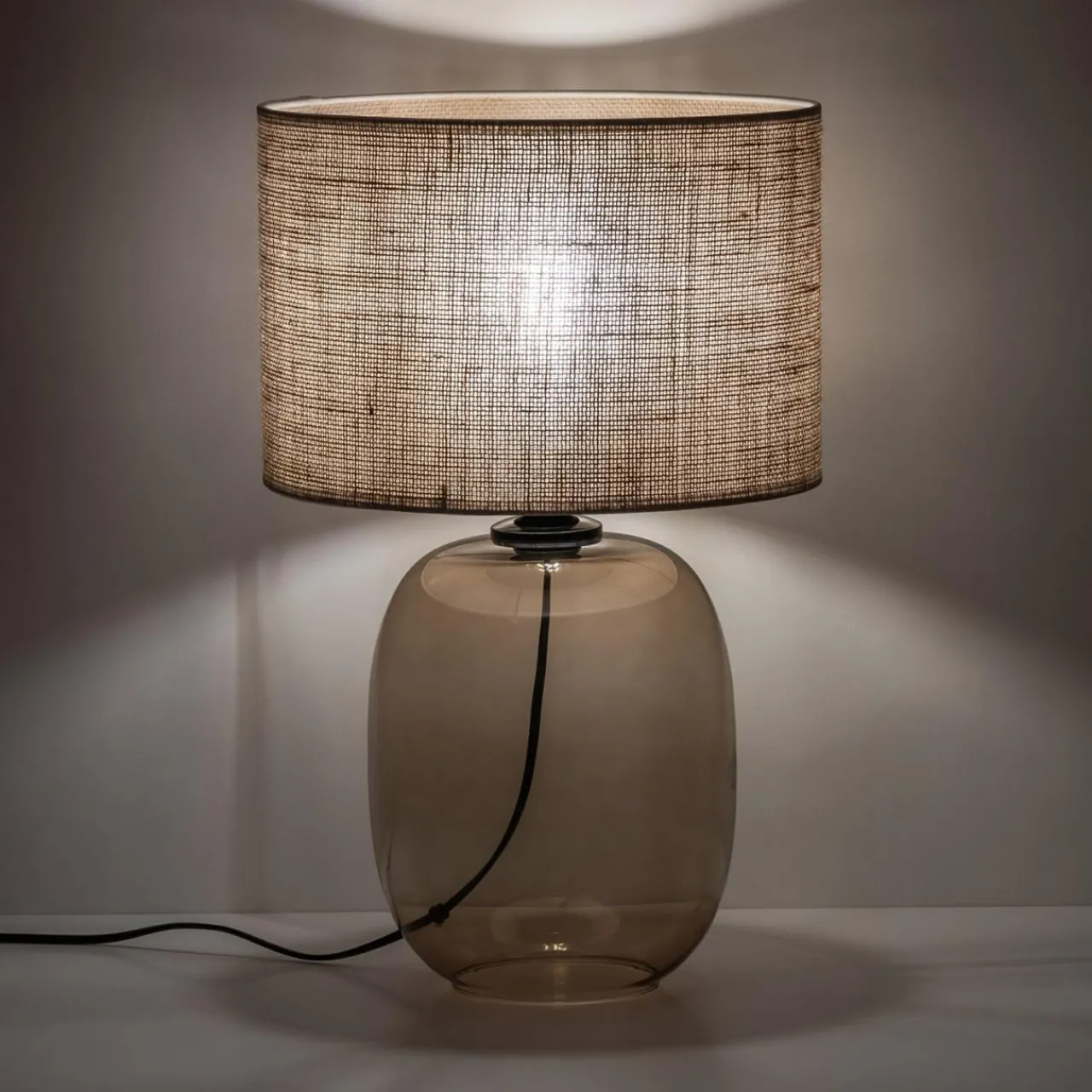 - Podstawa jest owalna, z przydymionego szkła – jej ciepły odcień dodaje wnętrzu przytulności.