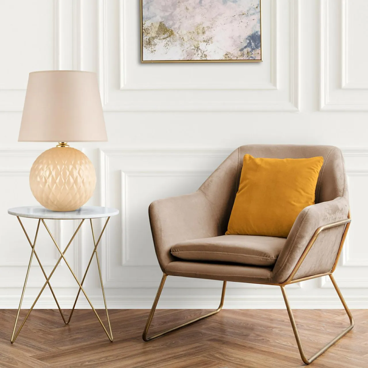 Podstawa lampy SANTANA jest kulista, ze wzorem w romby. Wykonana została ze szkła w odcieniu ecru ze złotym wykończeniem przy oprawie żarówki.