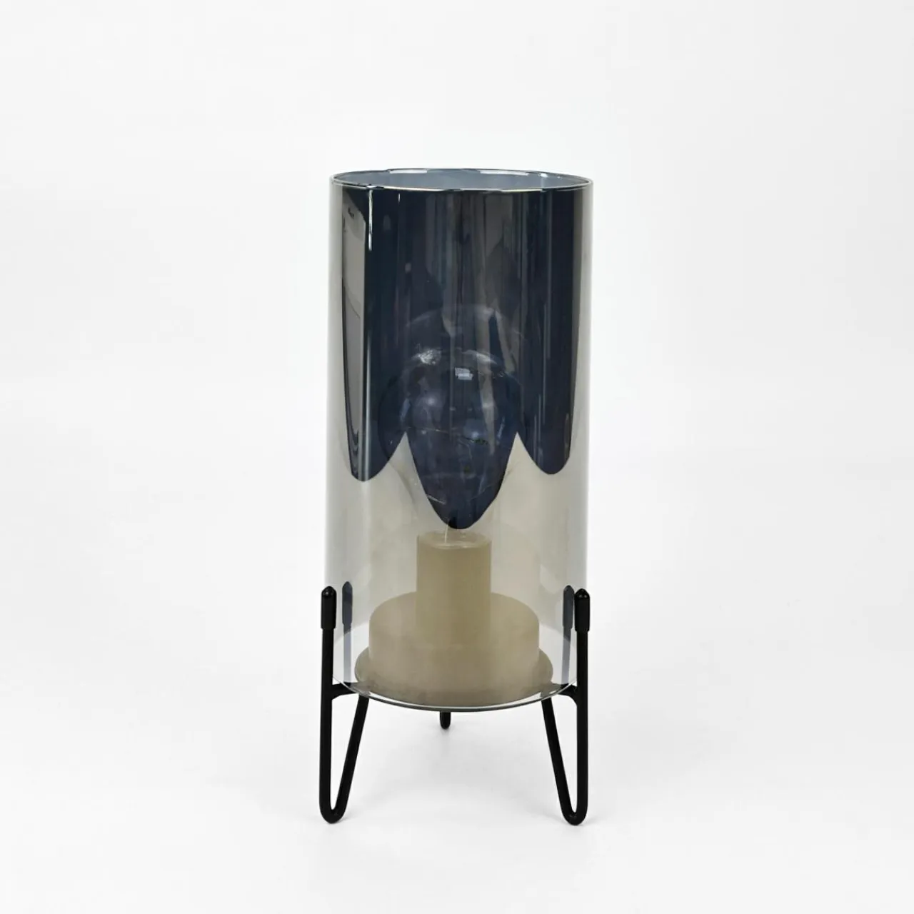 - Szklany klosz o kształcie walca w kolorze ciemnej szarości został ustawiony na 3 ozdobnych nóżkach.