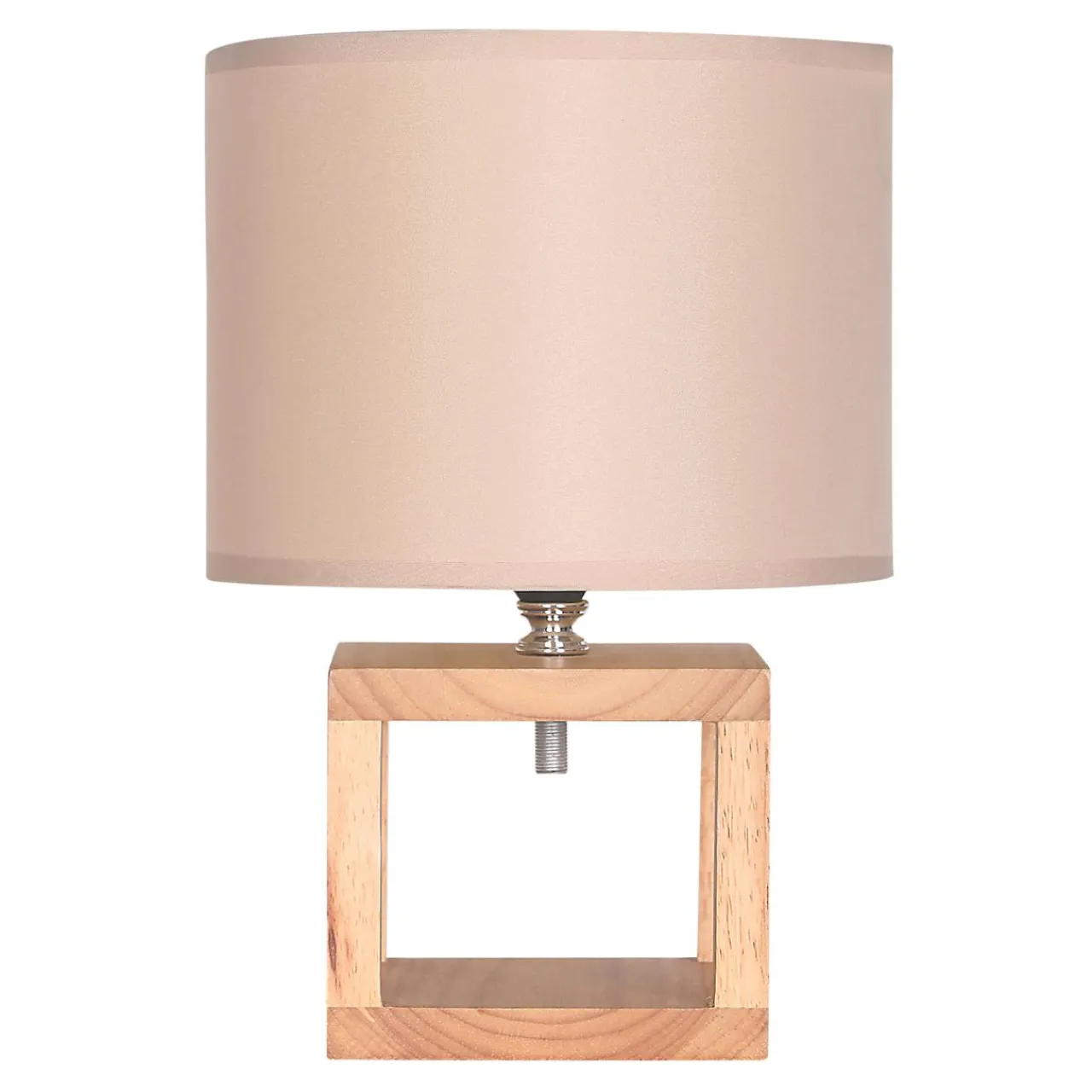 - Abażur ma nowoczesny kształt, opinająca go tkanina jest brązowa.