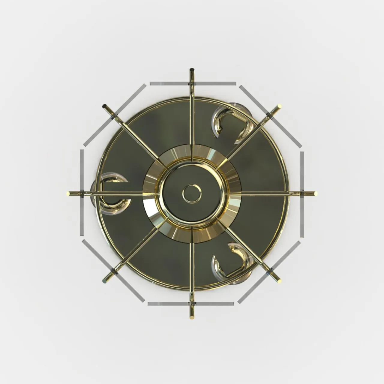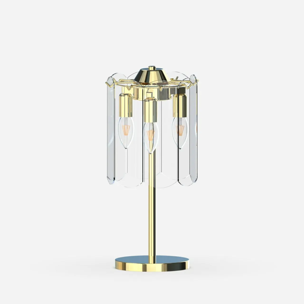 - Modny kształt lampy oparty jest ozdobach o regularnym kształcie, wykonanych ze szkła. Wykończenie lampy łączy oprawę w złotym kolorze z transparentnym kloszem, wewnątrz którego doskonale widać kształty 3 żarówek.