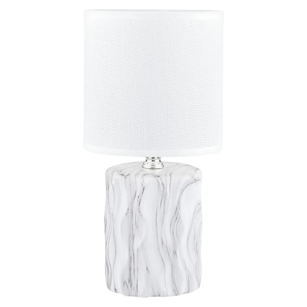 Niewielka lampa została wykończona w bieli i zwieńczona abażurem.