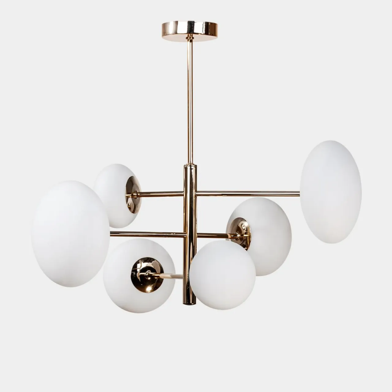 6 mlecznobiałych kloszy wieńczących podstawę w złotym kolorze oświetli i podkreśli charakterystyczne cechy pomieszczenia.