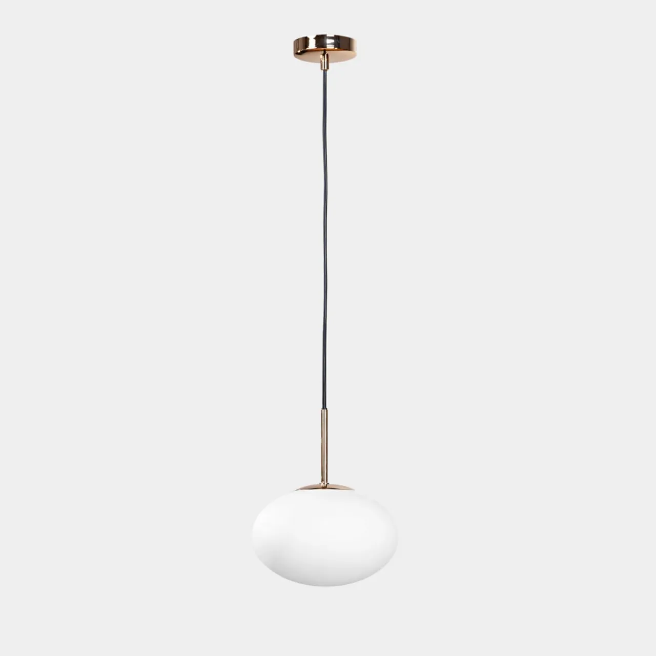 - Oprawa wykończona złotym kolorem została dopełniona przez mlecznobiały klosz o obłym kształcie. To zestawienie wpasuje się w nowoczesne wnętrze, ciążące w stronę estetyki glamour.
