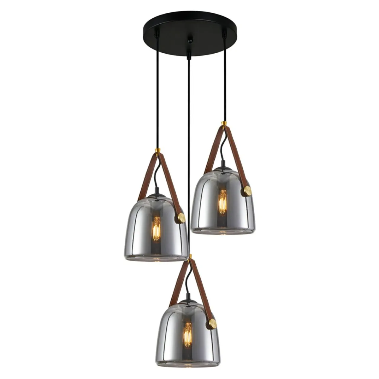 - Modny kształt lampy oparty jest na 3 kloszach o kształcie kopuł. Wszystkie zostały wykonany z przydymionego szkła.