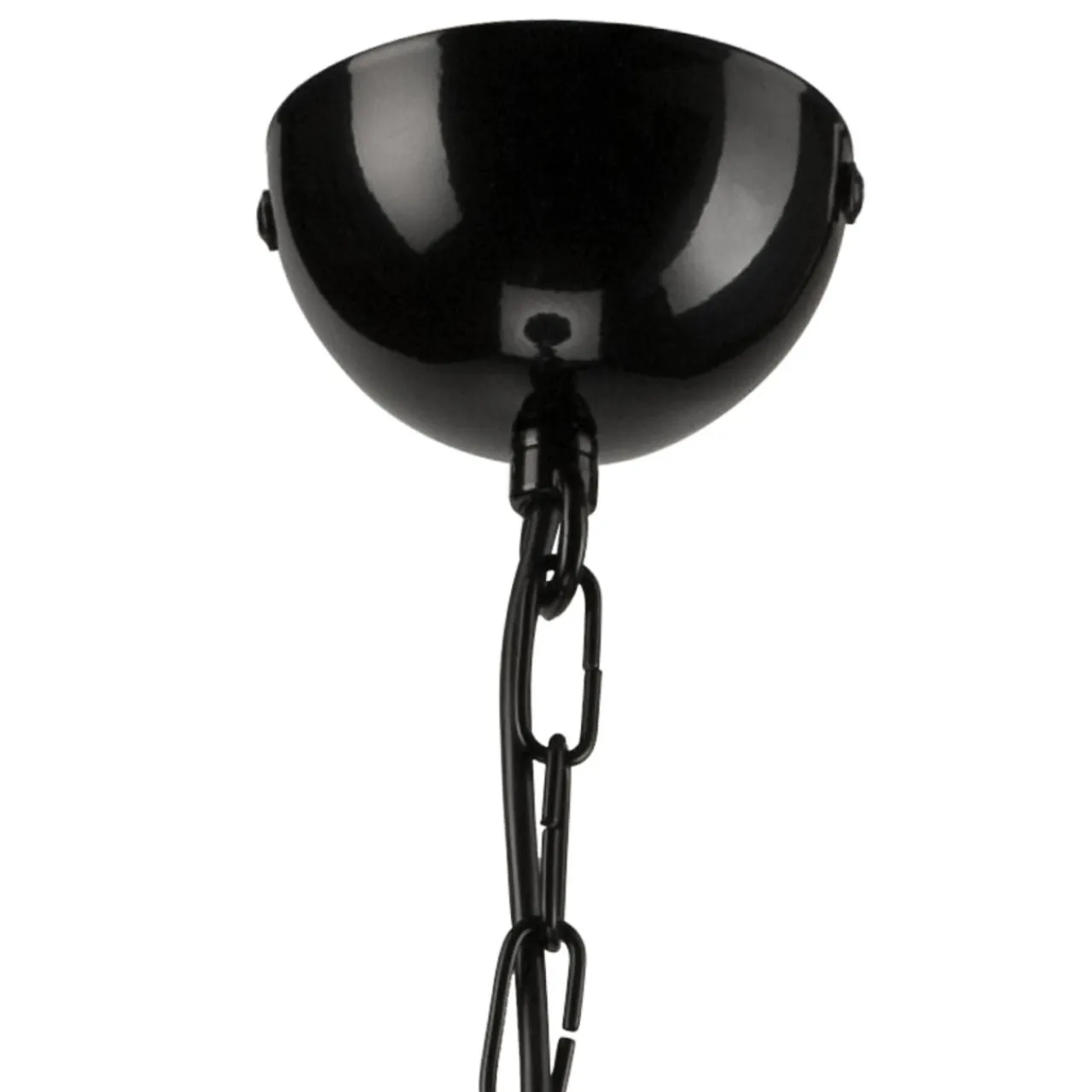 Czarne wykończenie lampy lekko błyszczy w świetle, a jednolity kolor bazy i ozdobnego łańcucha podkreśla metaliczny odcień miedzi przy oprawie żarówki.