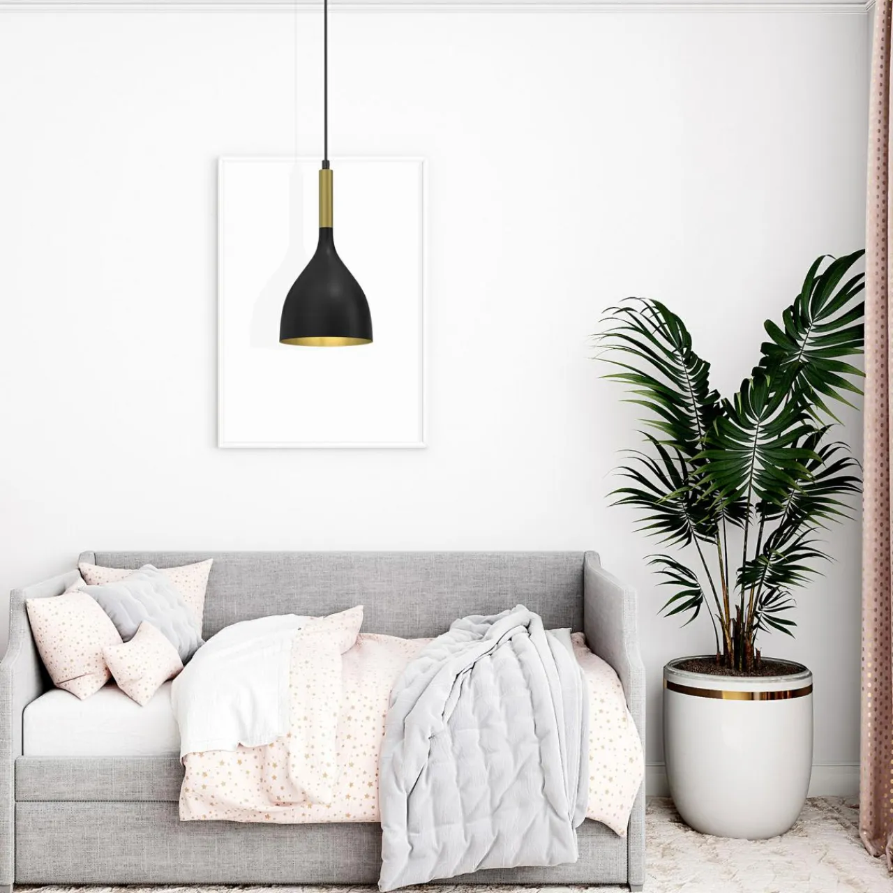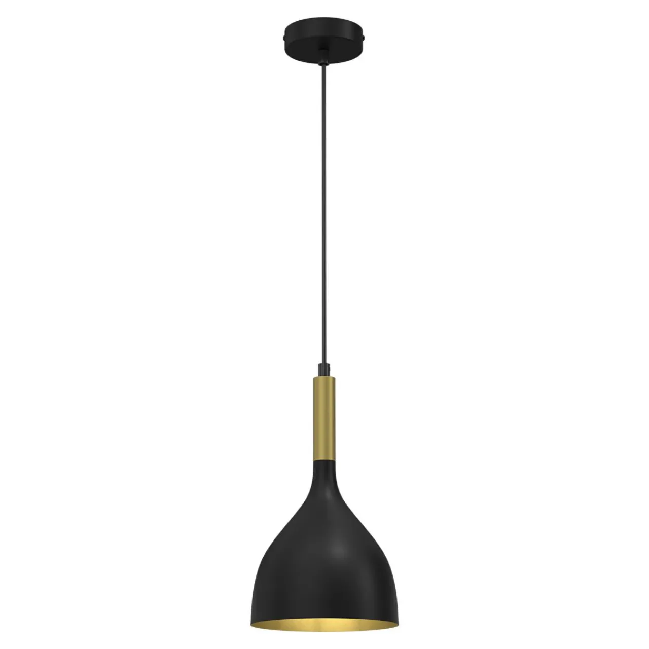 Czarny klosz w kształcie dzwonu jest opatrzony dekoracją z w złotym kolorze, a całość jest utrzymana w matowym odcieniu. Dzięki temu zabiegowi NOAK doskonale komponuje się z meblami utrzymanymi w stylach nowoczesnym i loftowym lecz jednocześnie jej design pozwala na dużą swobodę pod kątem aranżacyjnym.