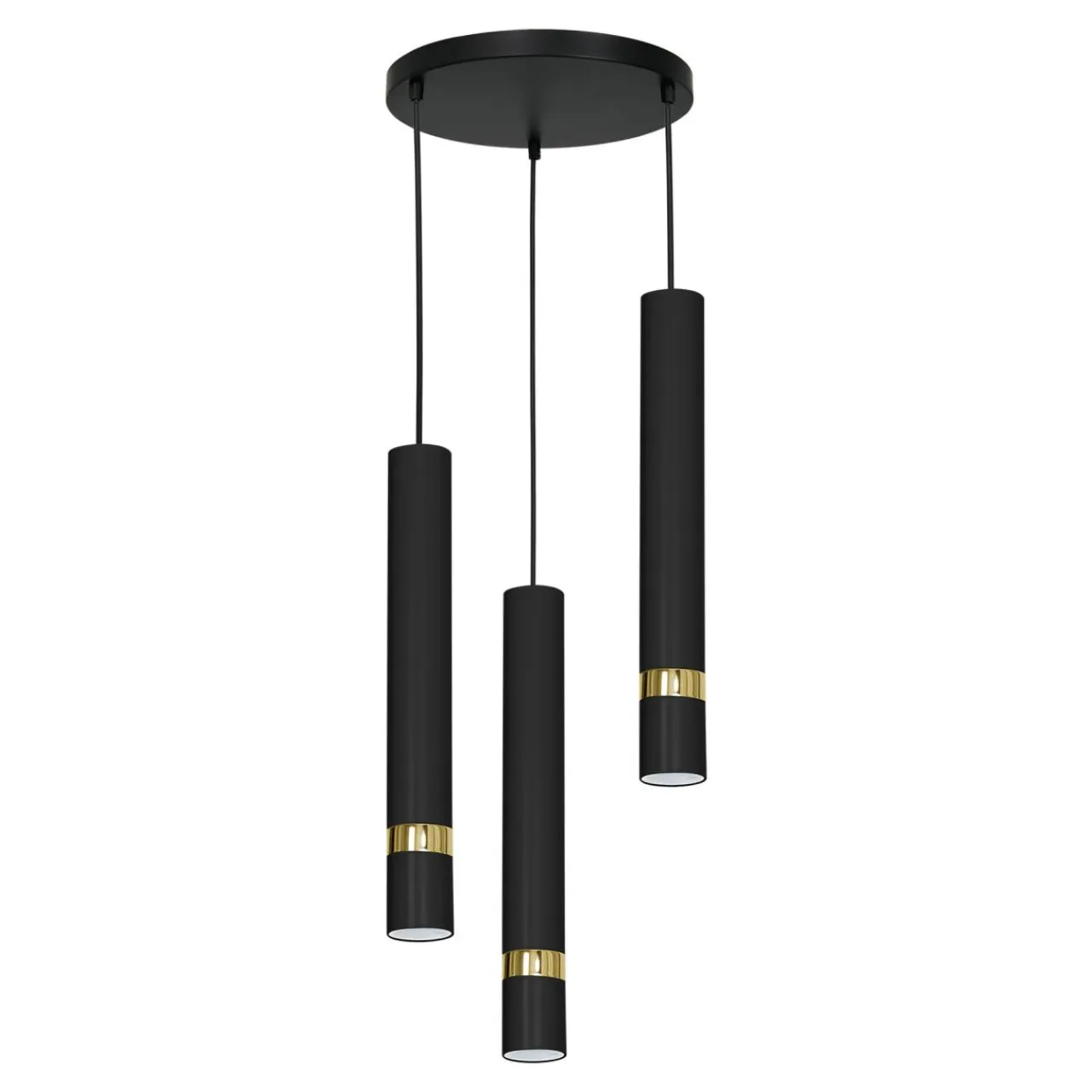 - Okrągła podstawa lampy z 3 skierowanymi pionowo w dół walcami została wykonana z lakierowanego metalu. Cechą charakterystyczną pierścienie w kolorze złota.