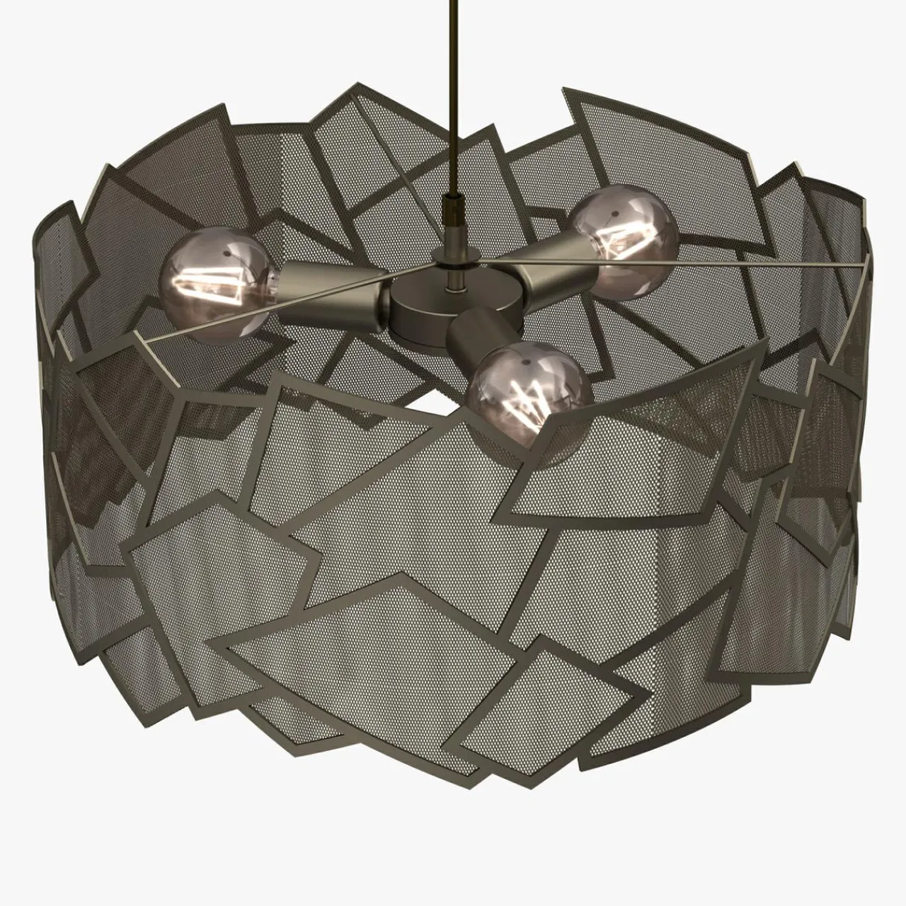 - Metalowy abażur wiszącej lampy CAMO zwraca uwagę ciekawym wzorem – siateczka w czarnym kolorze wpisana w ostro zakończone geometryczne figury. Nachodzące na siebie kształty dyskretnie przysłaniają żarówki.