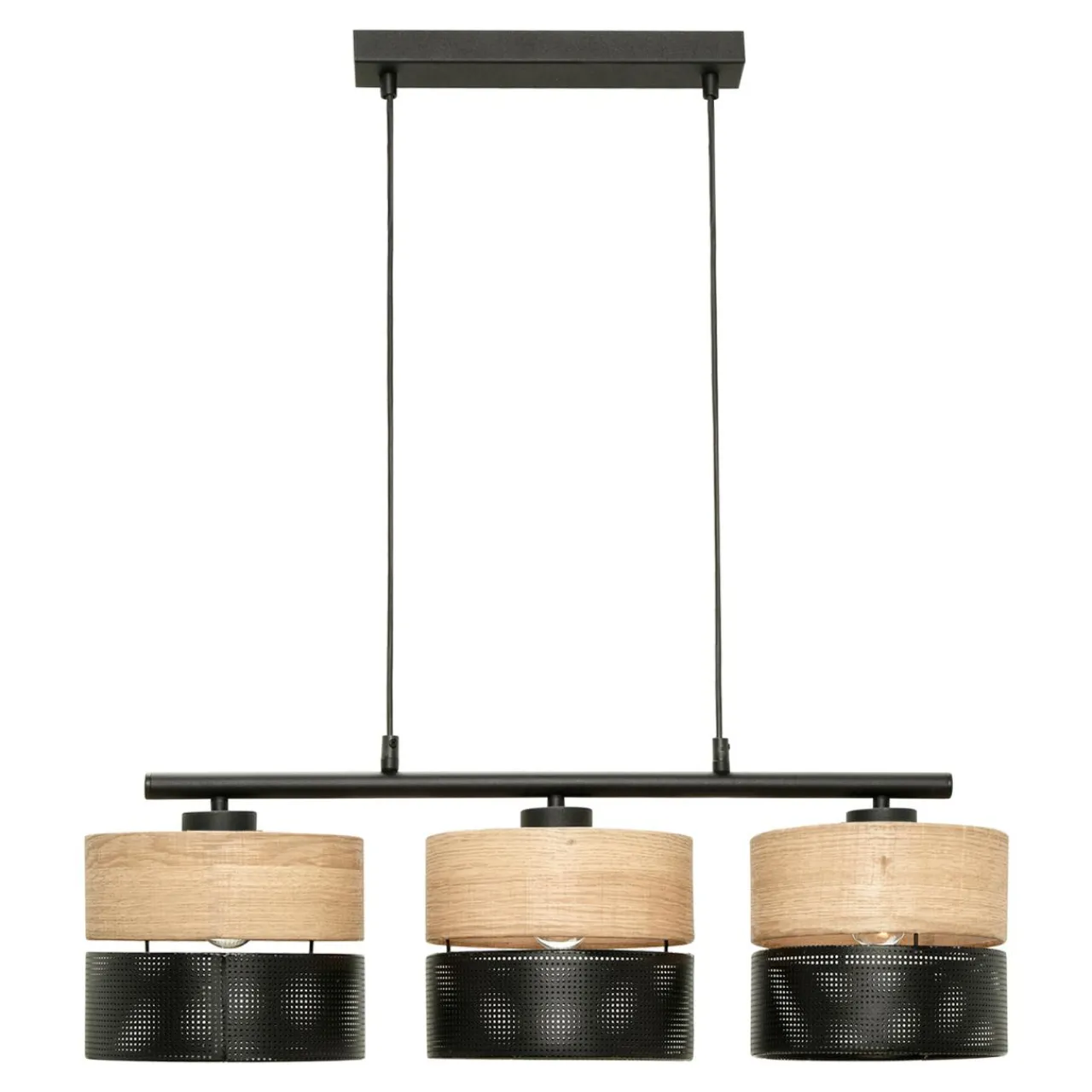 Potrójny model lampy NICOL został zawieszony na listwie, do której przymocowane są 3 szeregowo zawieszone abażury.