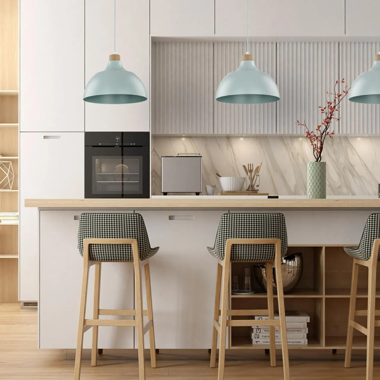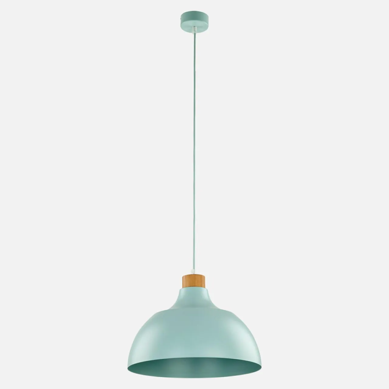 - Ciekawe połączenie drewnianych elementów ozdobnych oraz metalowego klosza w kolorze mięty sprawia, że lampa współgra z meblami zarówno w kolorystyce bieli, szarości oraz zieleni i błekitu.