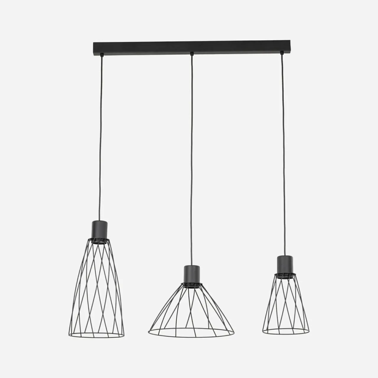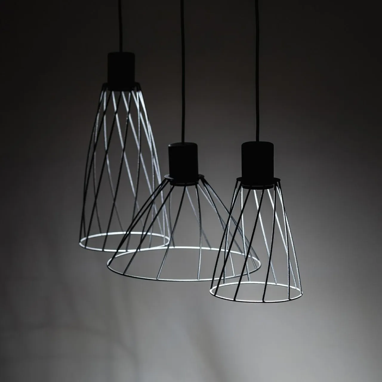 Model wiszący lampy z 3 kloszami (każdy o innym kształcie) i oprawą dla 3 żarówek GU10 wykorzystasz w dużych, reprezentacyjnych pomieszczeniach.