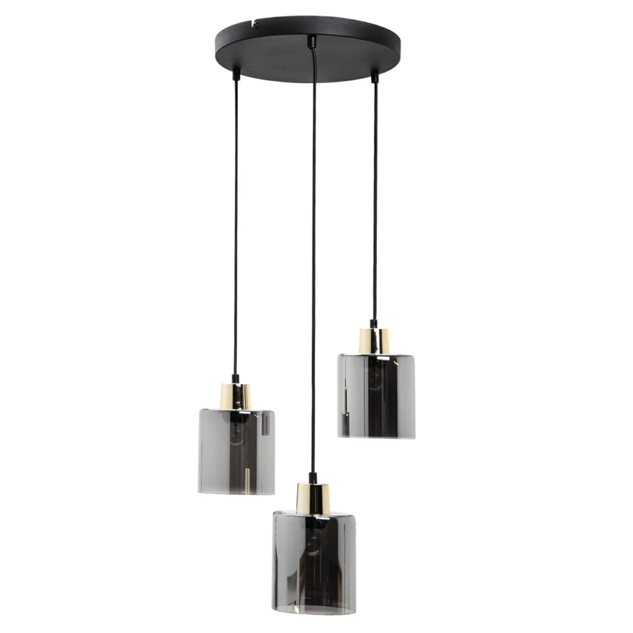 Lampa SIERRA posiada okrągłą podstawę w czarnym kolorze. Całości dopełniają zawieszone koncentrycznie 3 szklane klosze z grafitowym wykończeniem, uzupełnione połyskującym, złotym akcentem.