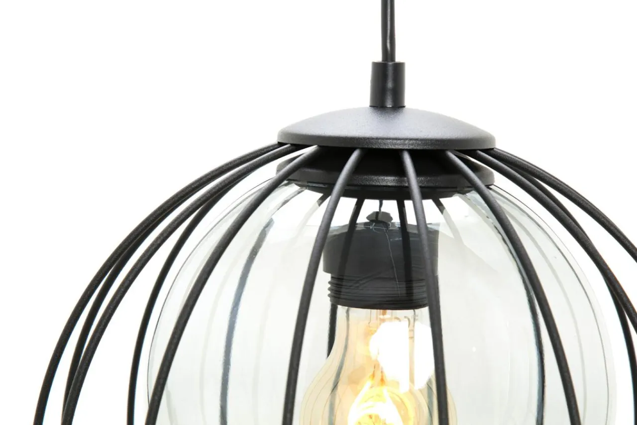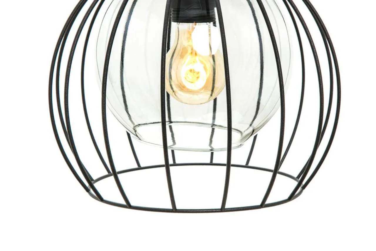 Czarne wykończenie klosza i podsufitki w ciekawy sposób kontrastuje z transparentnym szkłem klosza lampy, który pozwala na eksperyment z kształtem oraz kolorem żarówki oraz emitowanego przez nią światła.