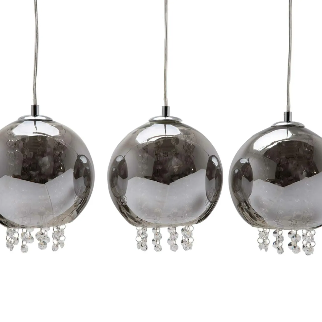 Metalowa baza w formie listwy montowanej do sufitu jest podstawa dla trzech źródeł światła, z których każde jest osłonięte odrębnym kloszem.