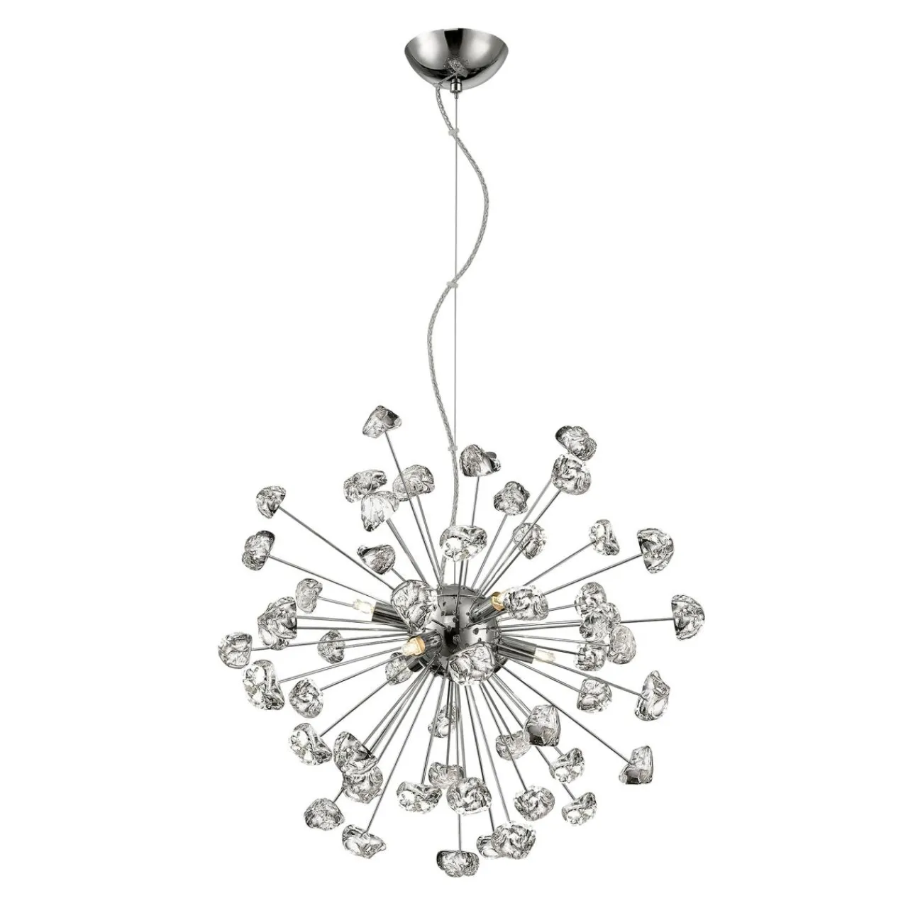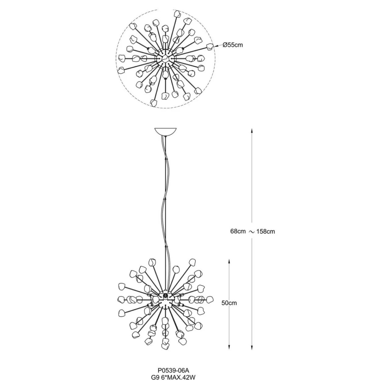 Lampa STAR jest oświetleniem przeznaczonym dla dużych, przestronnych wnętrz – jej średnica to 55 cm. Posiada oprawę przeznaczoną dla 6 żarówek typu G9 o mocy maksymalnej 42W. Wysokość zawieszenia można regulować w zakresie 68 – 158 cm.