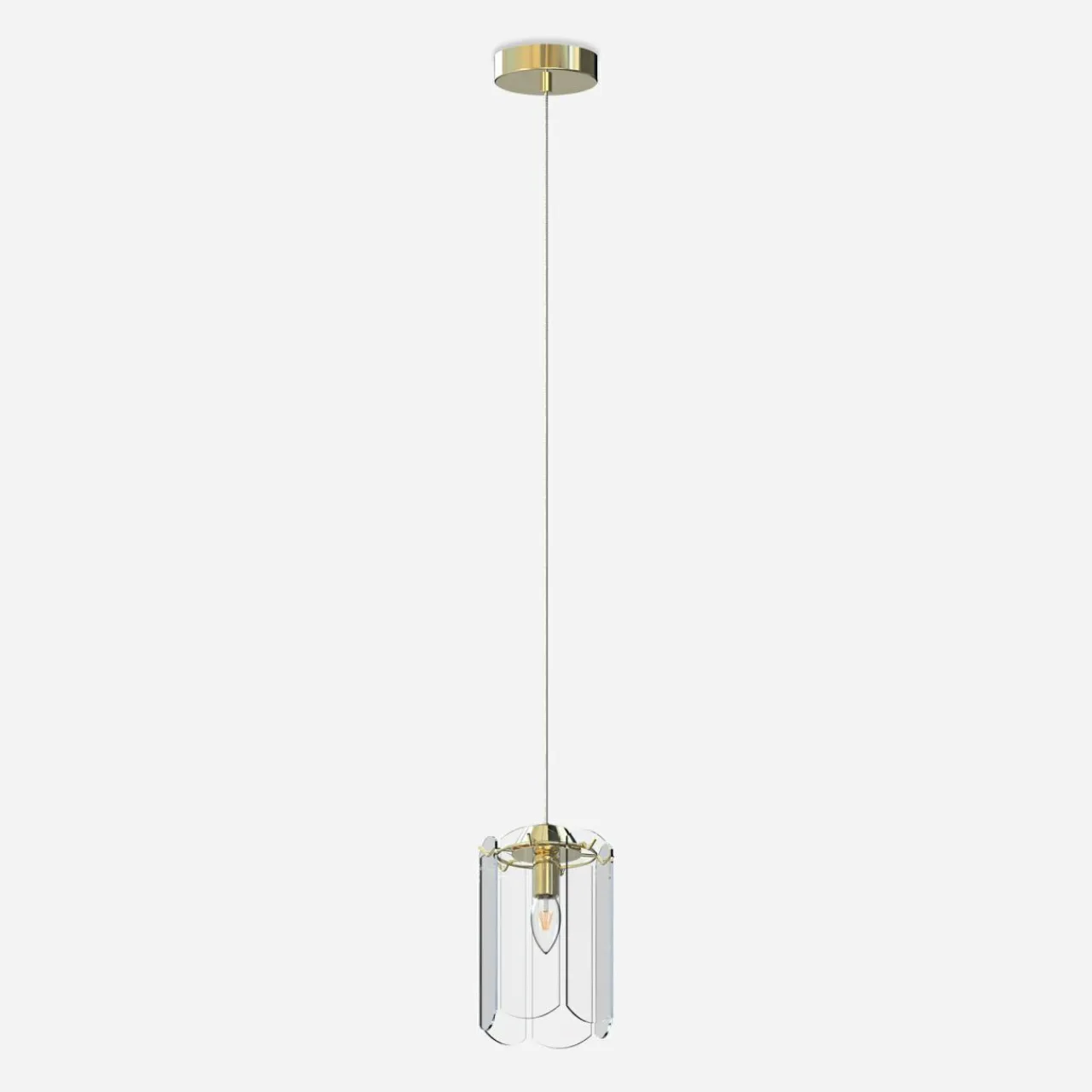 - Modny kształt lampy oparty jest ozdobach o regularnym kształcie, wykonanych ze szkła. Wykończenie lampy łączy złoto oprawy z transparentnym kloszem, wewnątrz którego doskonale widać kształt żarówki.