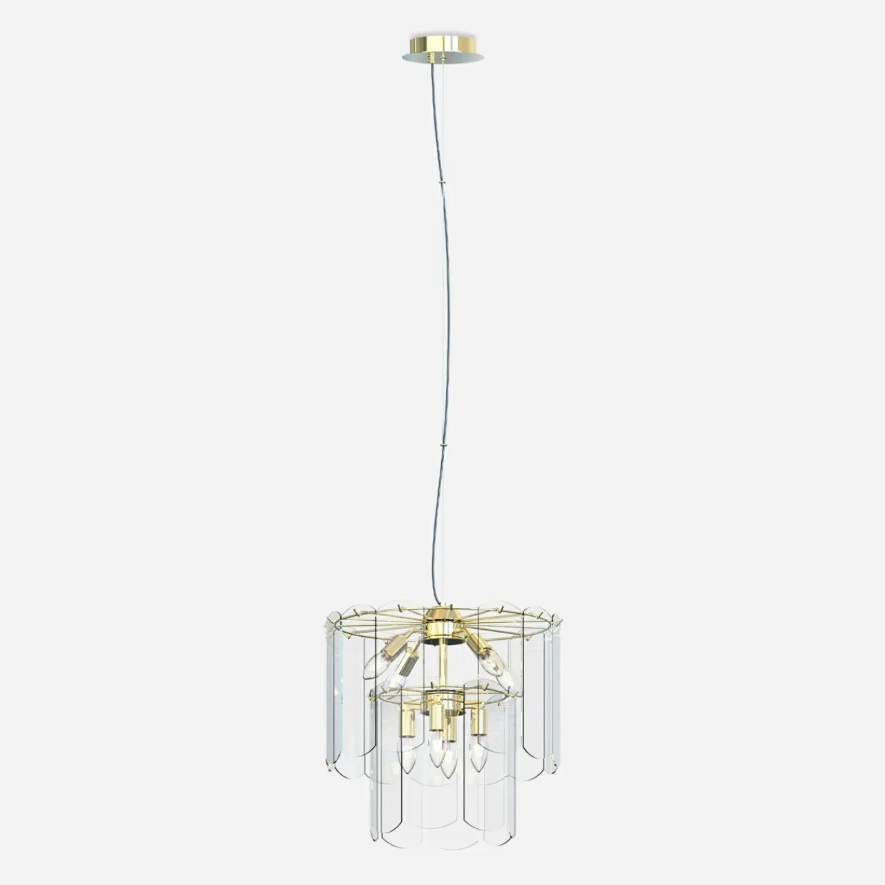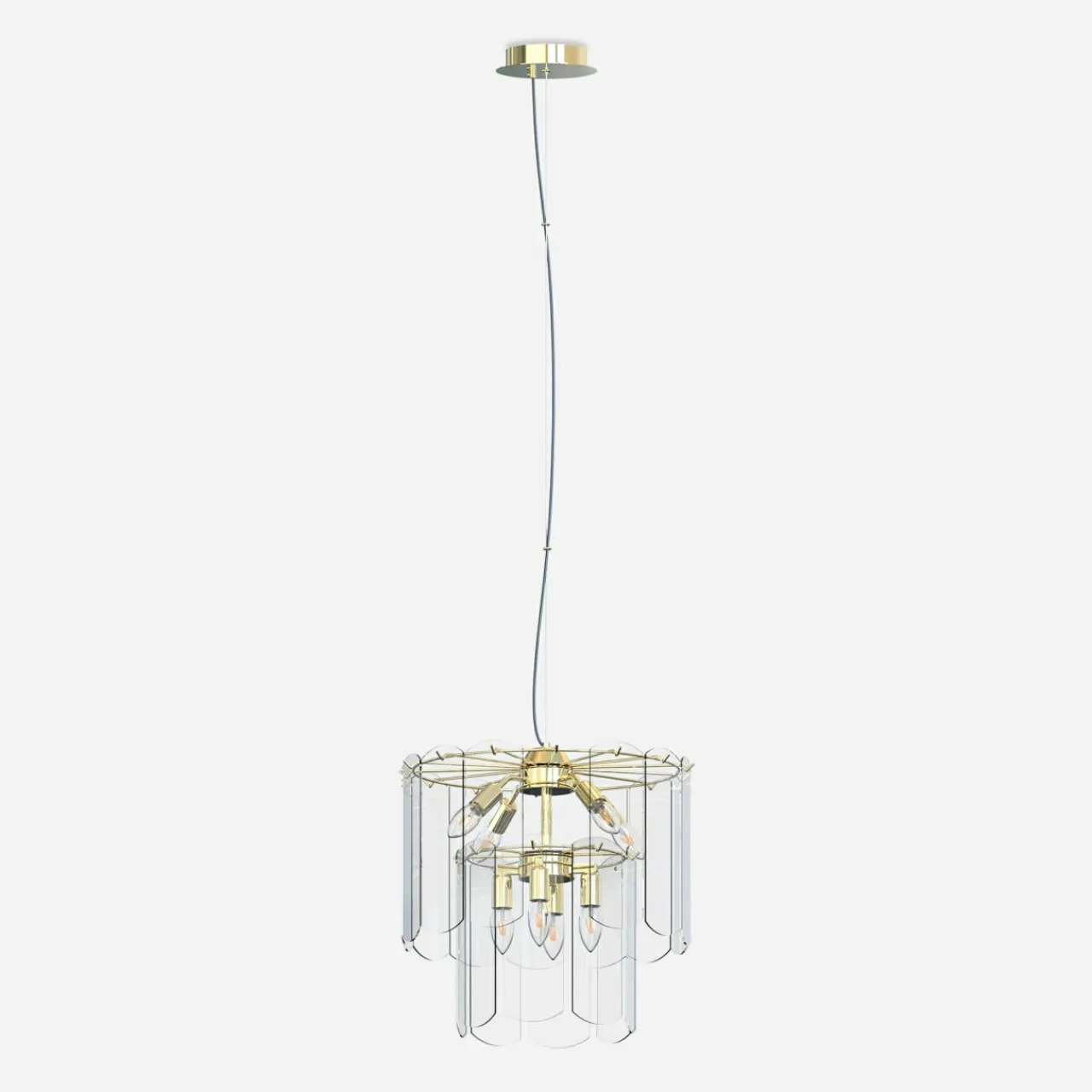 - Modny kształt lampy oparty jest ozdobach o regularnym kształcie, wykonanych ze szkła. Wykończenie lampy łączy złoty kolor oprawy z transparentnym kloszem, wewnątrz którego doskonale widać kształty 8 żarówek.