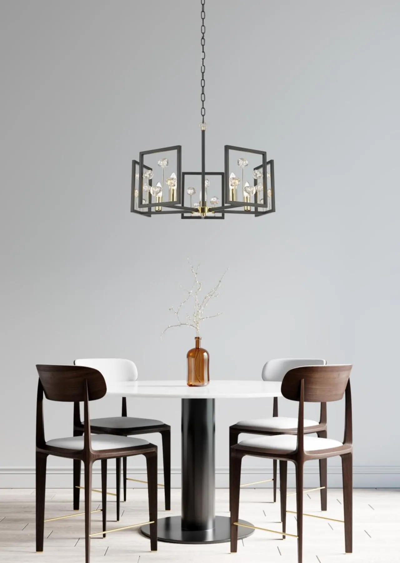 Uroda CAROLINE rozkwita po zapaleniu 5 żarówek umieszczonych w okręgu pośród szklanych, dekoracyjnych elementów. Zestawione z oszczędną, czarną oprawą lekko przysłaniają światło po to, by rozbłysnąć po zapaleniu lampy.