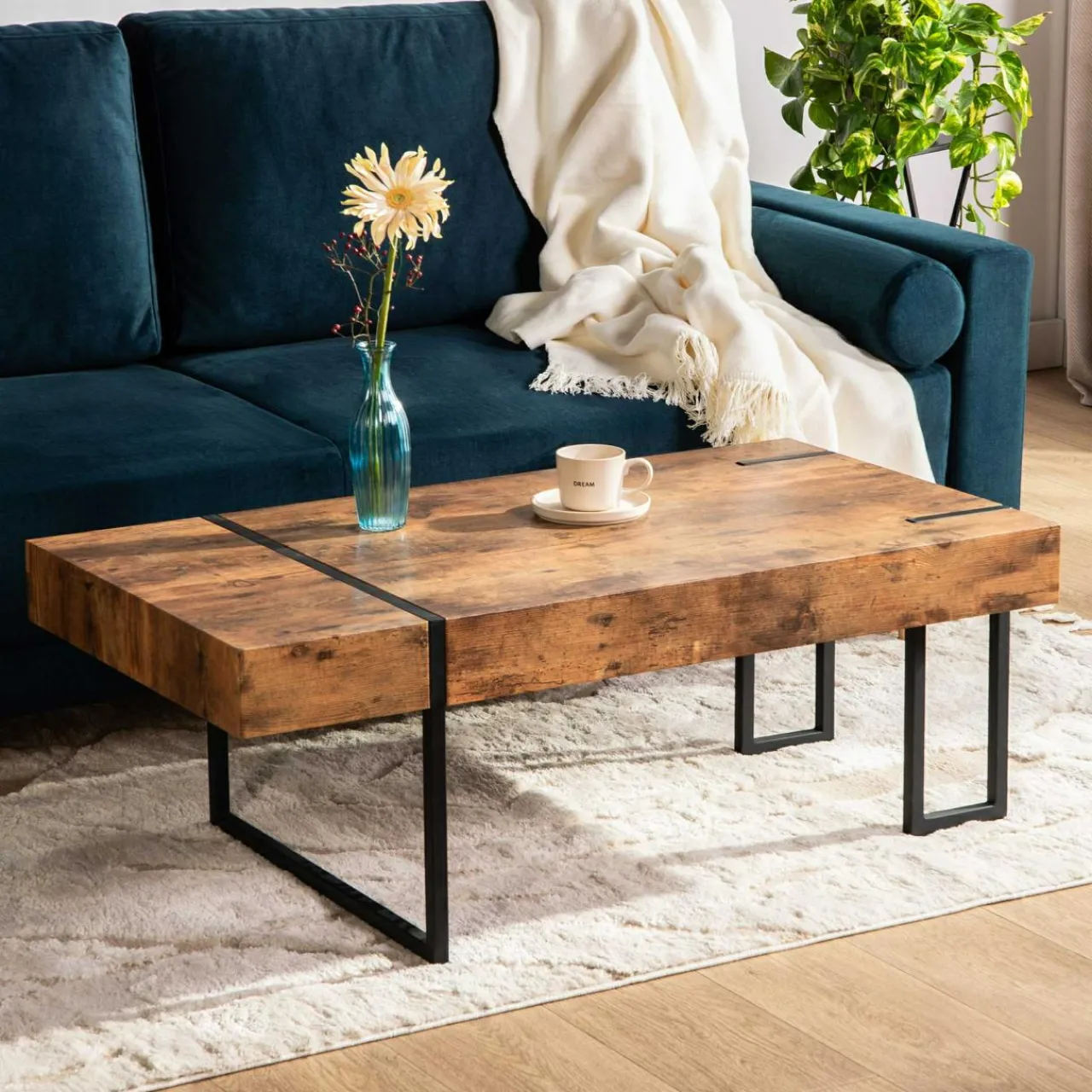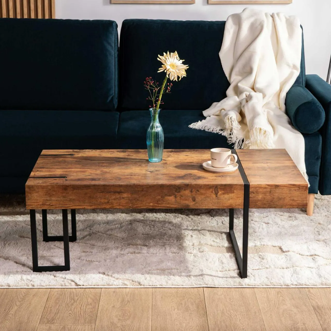 Zaprojektowano ją w taki sposób, by bez problemu móc ją przesuwać podczas sprzątania. Masywny blat przypomina lity kawałek drewna, ale jest o wiele lżejszy, bo wykonano go z płyty MDF.