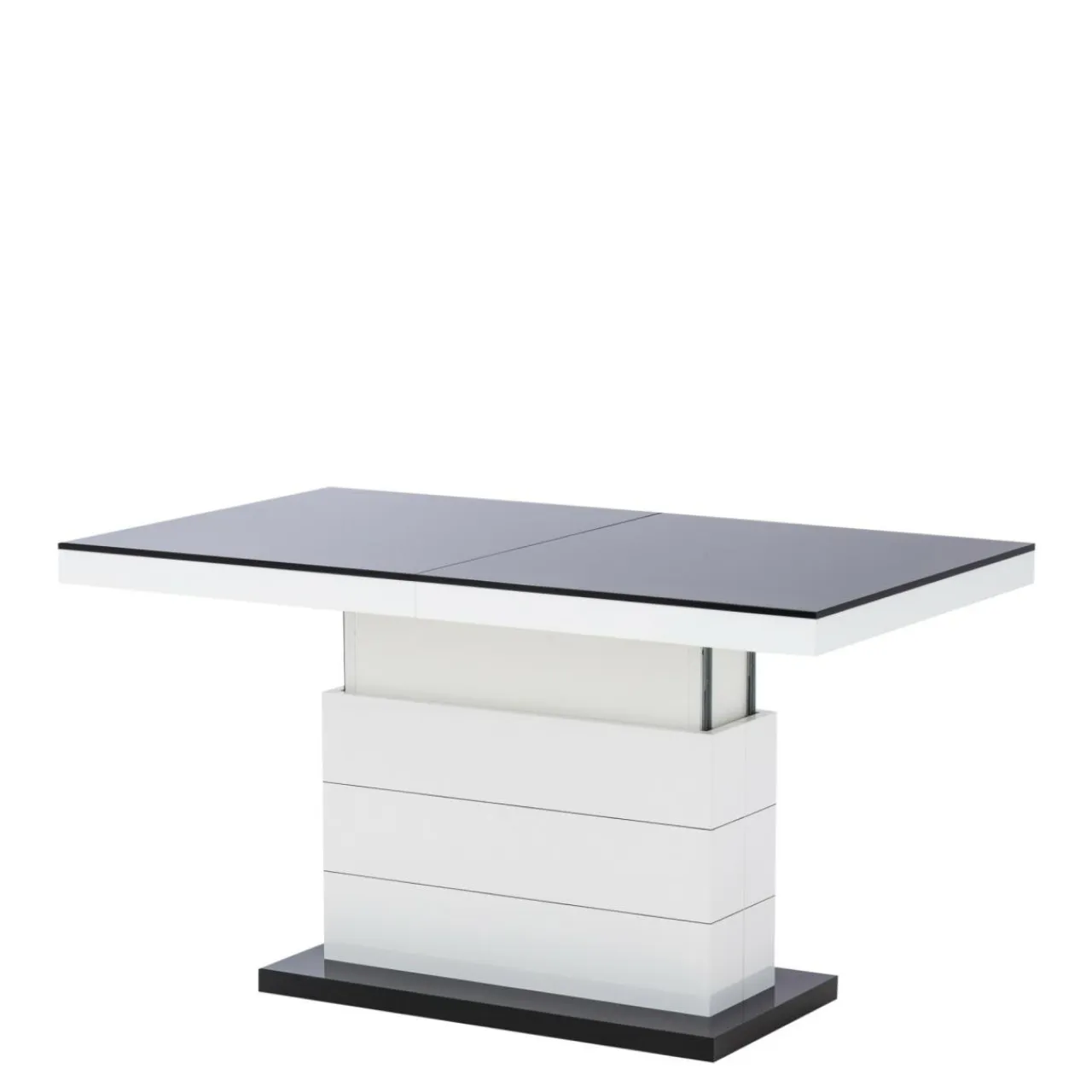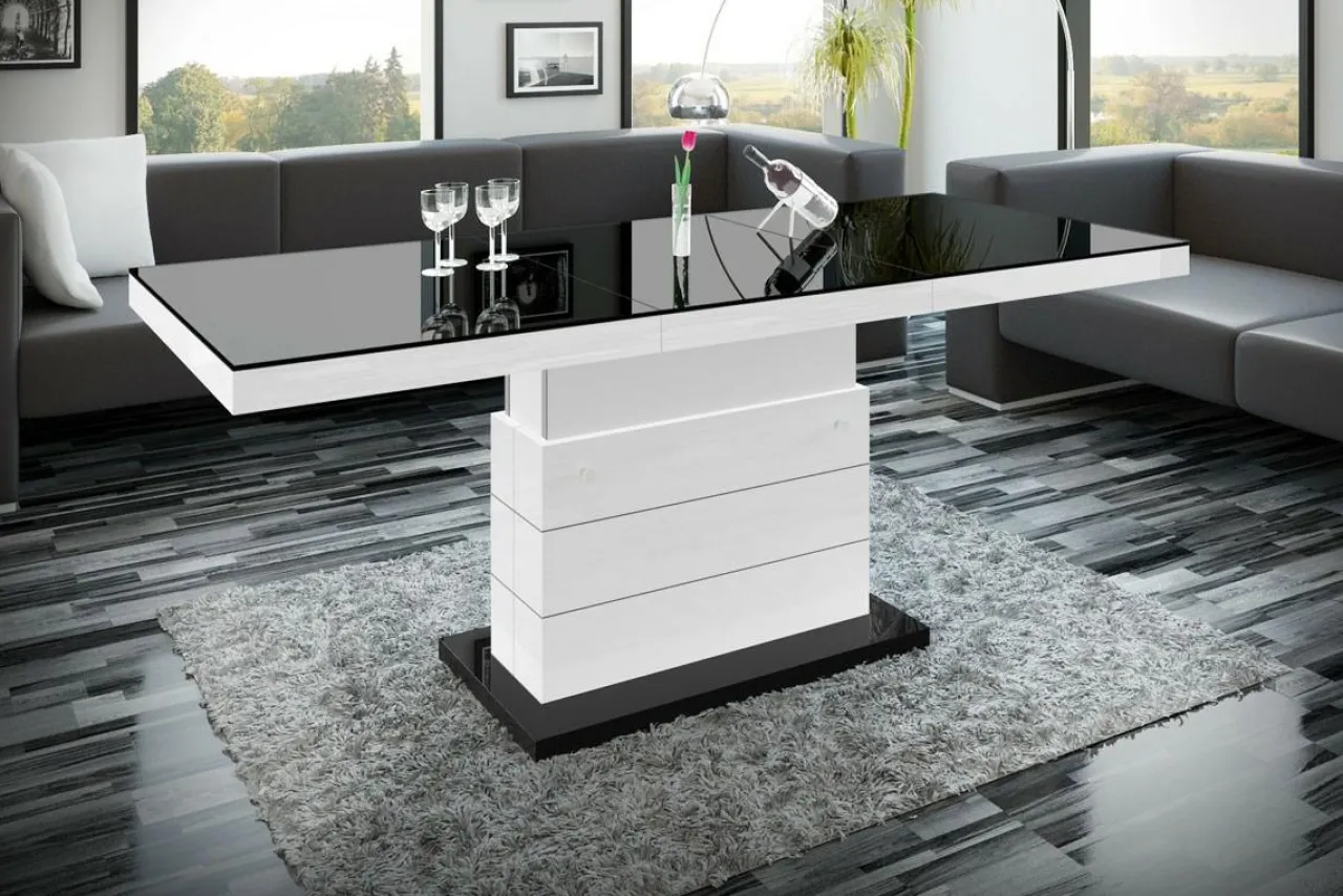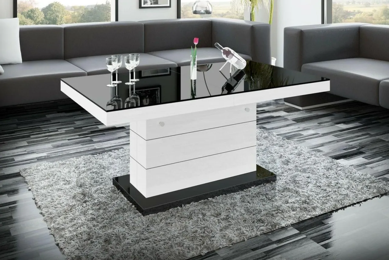 Podnoszona i rozkładana ława MATERA LUX to nowoczesny dodatek do salonu. W modnym połączeniu czerni i bieli, będzie pięknie prezentować się w salonie, ale też w biurze i innych przestrzeniach. Zamiast czterech nóg zastosowano stabilną podstawę z dekoracyjnymi, poziomymi nacięciami. Całość prezentuje się bardzo efektownie, z pewnością zachwyci twoich gości. Blat ma efekt lustrzanej nawierzchni dzięki wykończeniu na wysoki połysk. Mebel dwa w jednym na pewno przyda się w niewielkich wnętrzach.