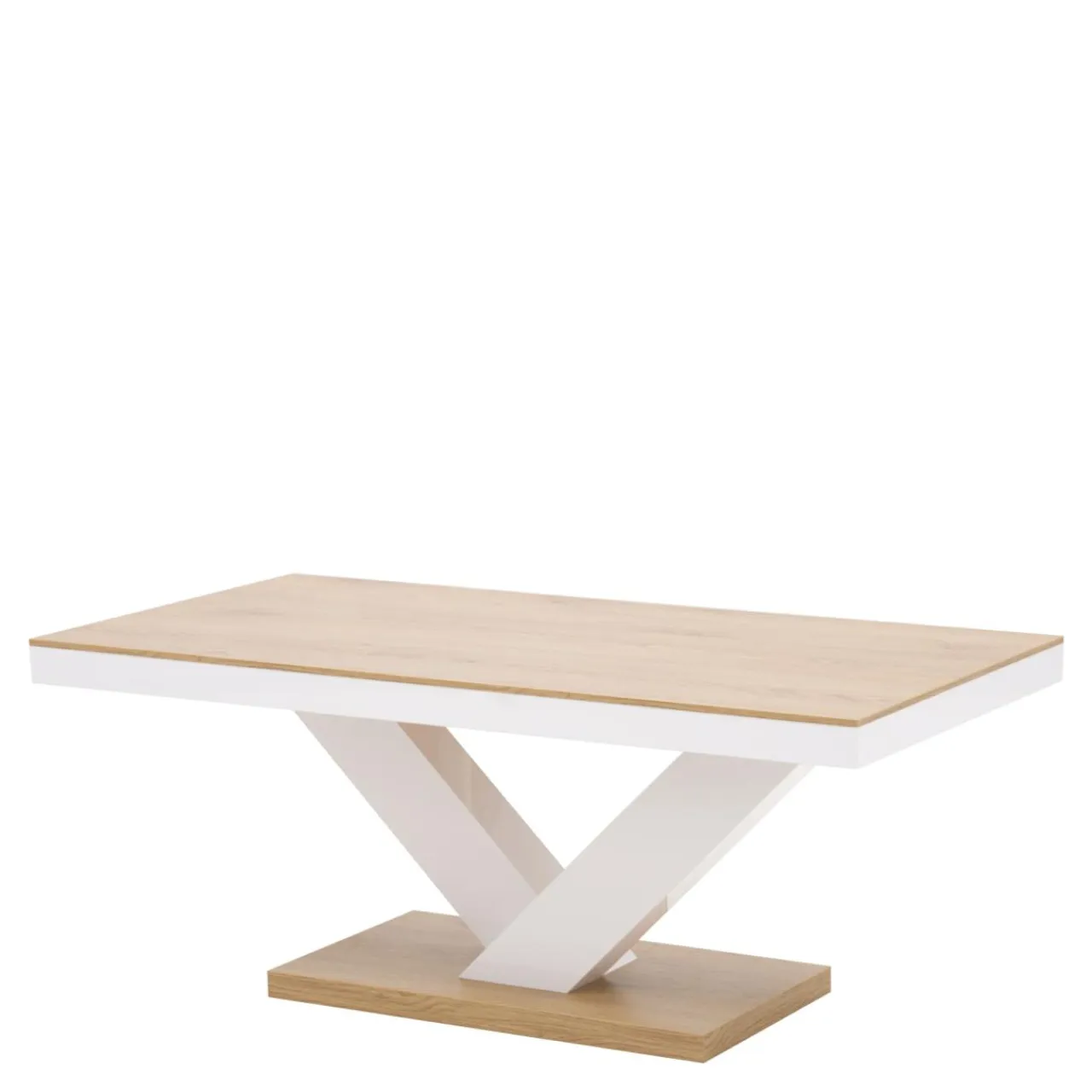 Ława ma białą podstawę i blat w kolorze jasnego drewna. Świetnie sprawdzi się w kąciku wypoczynkowym postawiona przed szarym narożnikiem lub sofą.