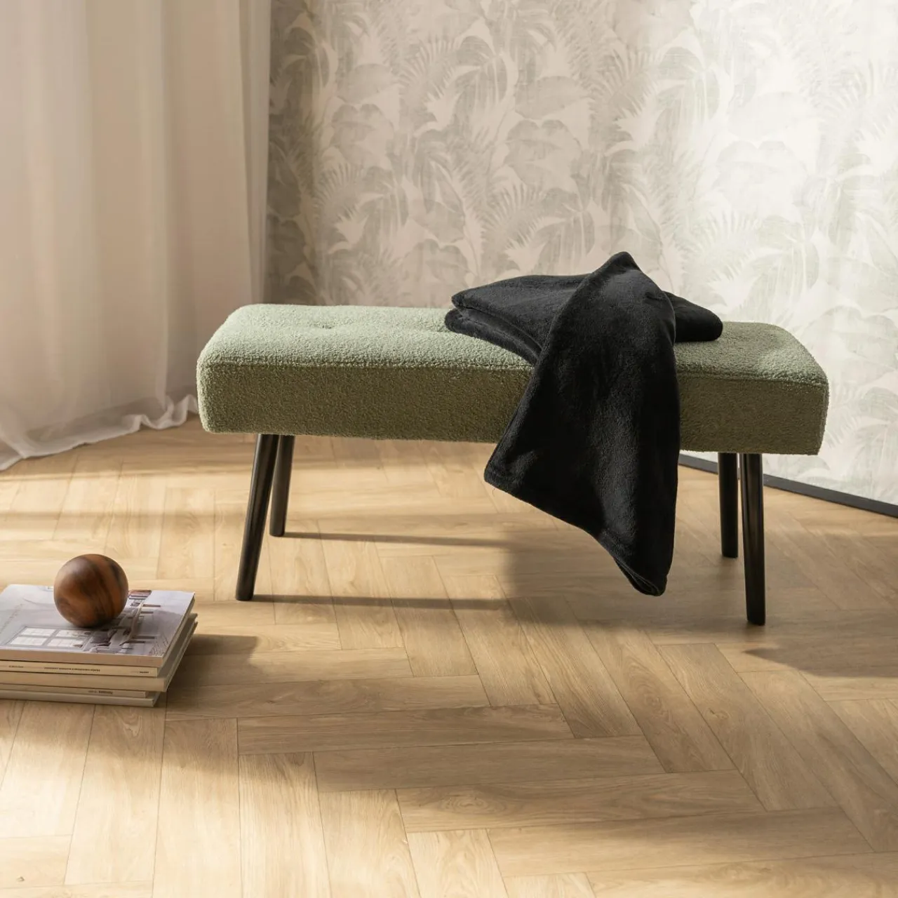 - Tkanina pętelkowa typu boucle sprawia, że ławka jest modnym dodatkiem do wnętrz.