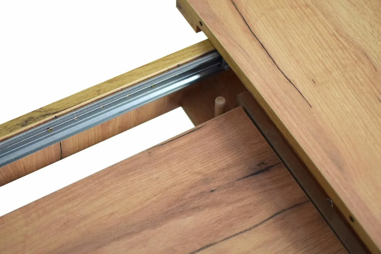 Stół w całości wykonany jest z płyt meblowych pokrytych laminatem imitującym drewno dębowe.