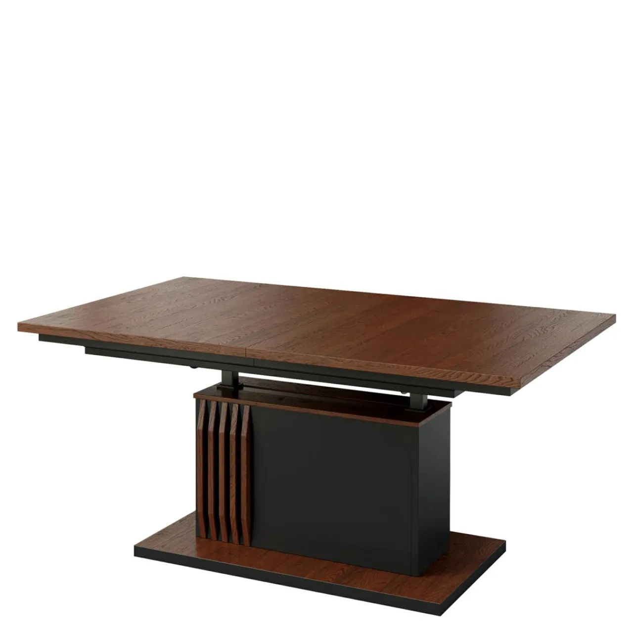 Dzięki prostej kolorystyce czerni, ciemnego drewna i podłużnym lamelom ławostół wpisze się w styl nowoczesny, ale też dark glamour. Wykorzystaj go jako centrum spotkań.