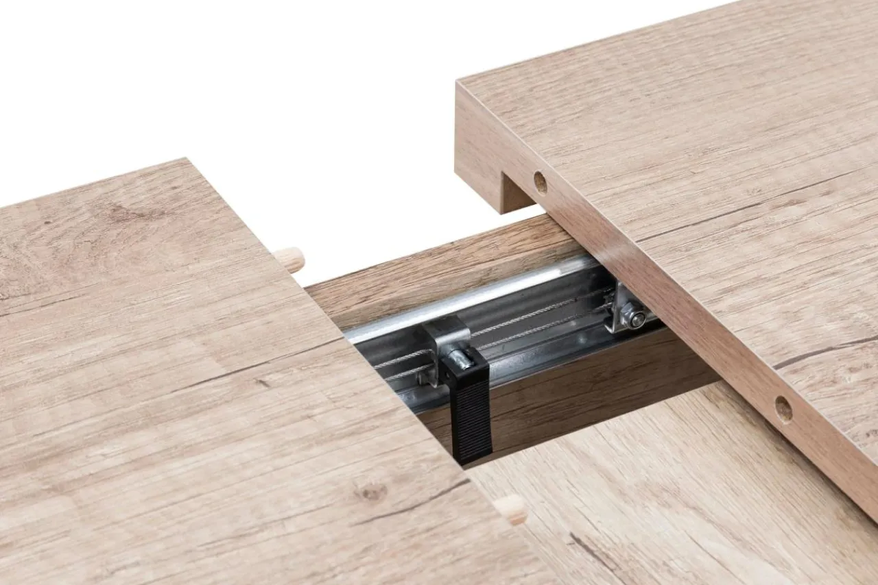 Wkładka ukryta pod blatem daje możliwość rozłożenia ławostołu do rozmiaru 156 cm. Aluminiowa synchroniczna z integrowanym hamulcem uławiają rozkładanie.